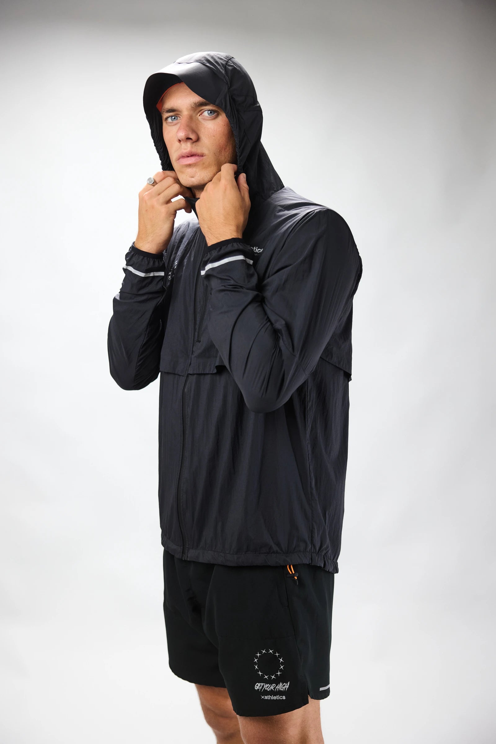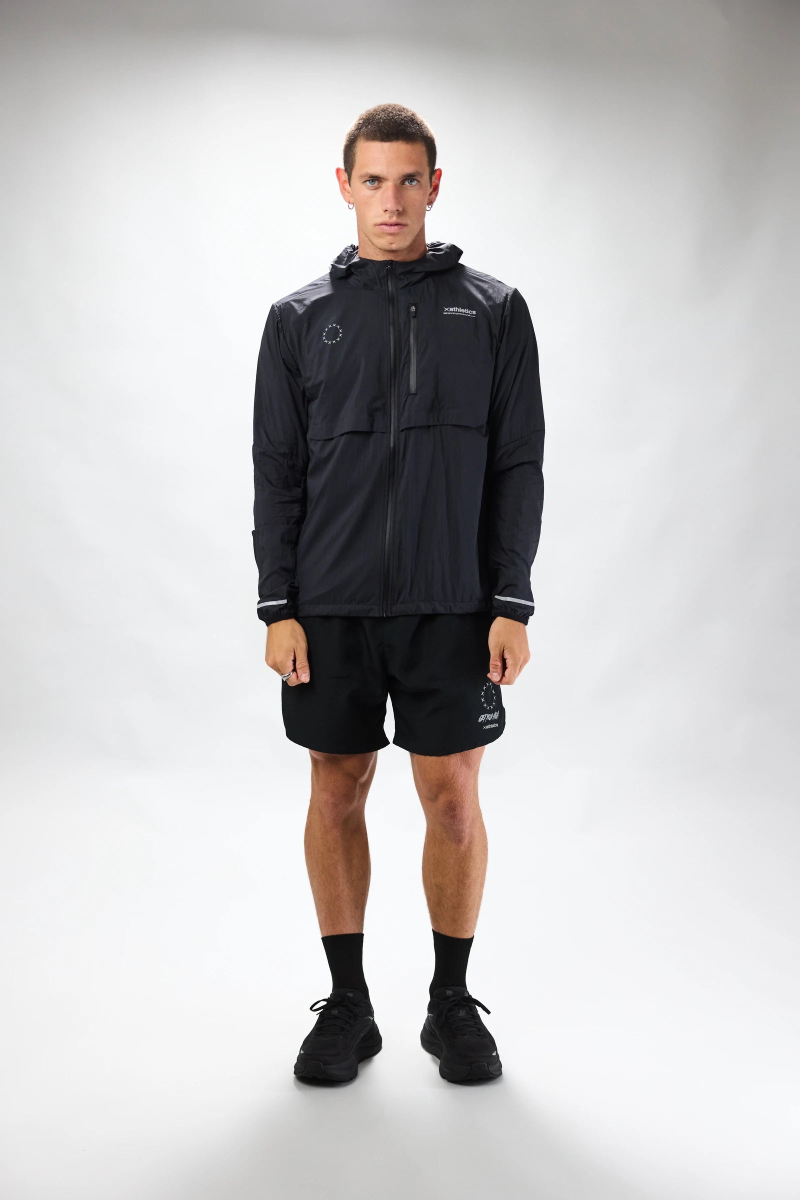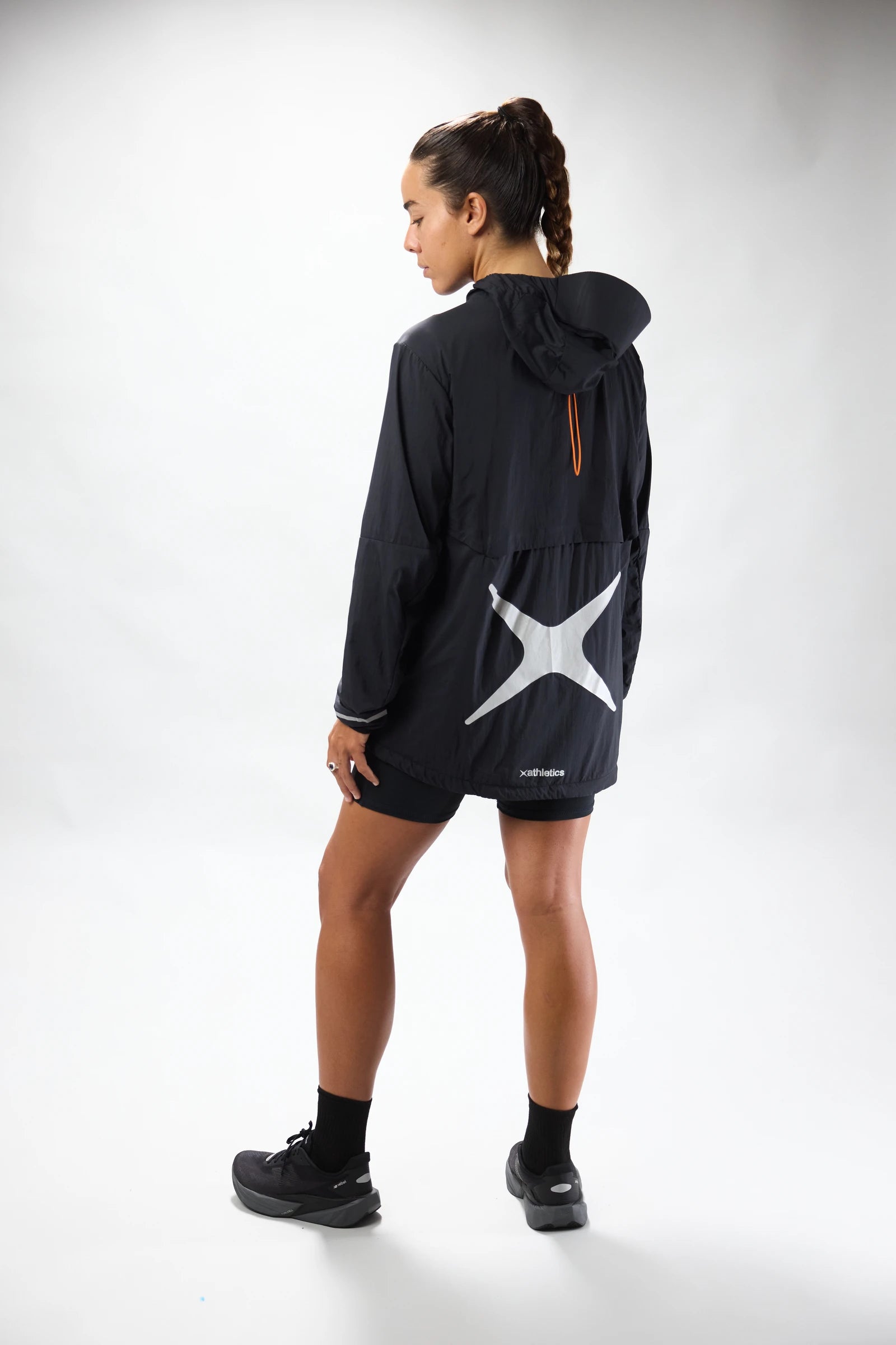 Windbreaker made from ultra-light nylon fabric, breathable, quick-dry, and UV50. Adjustable hood with visor. Reflective details for greater visibility. Zipped pocket on the left chest. Adjustable hem with elastic cord. Front and back ventilation openings.