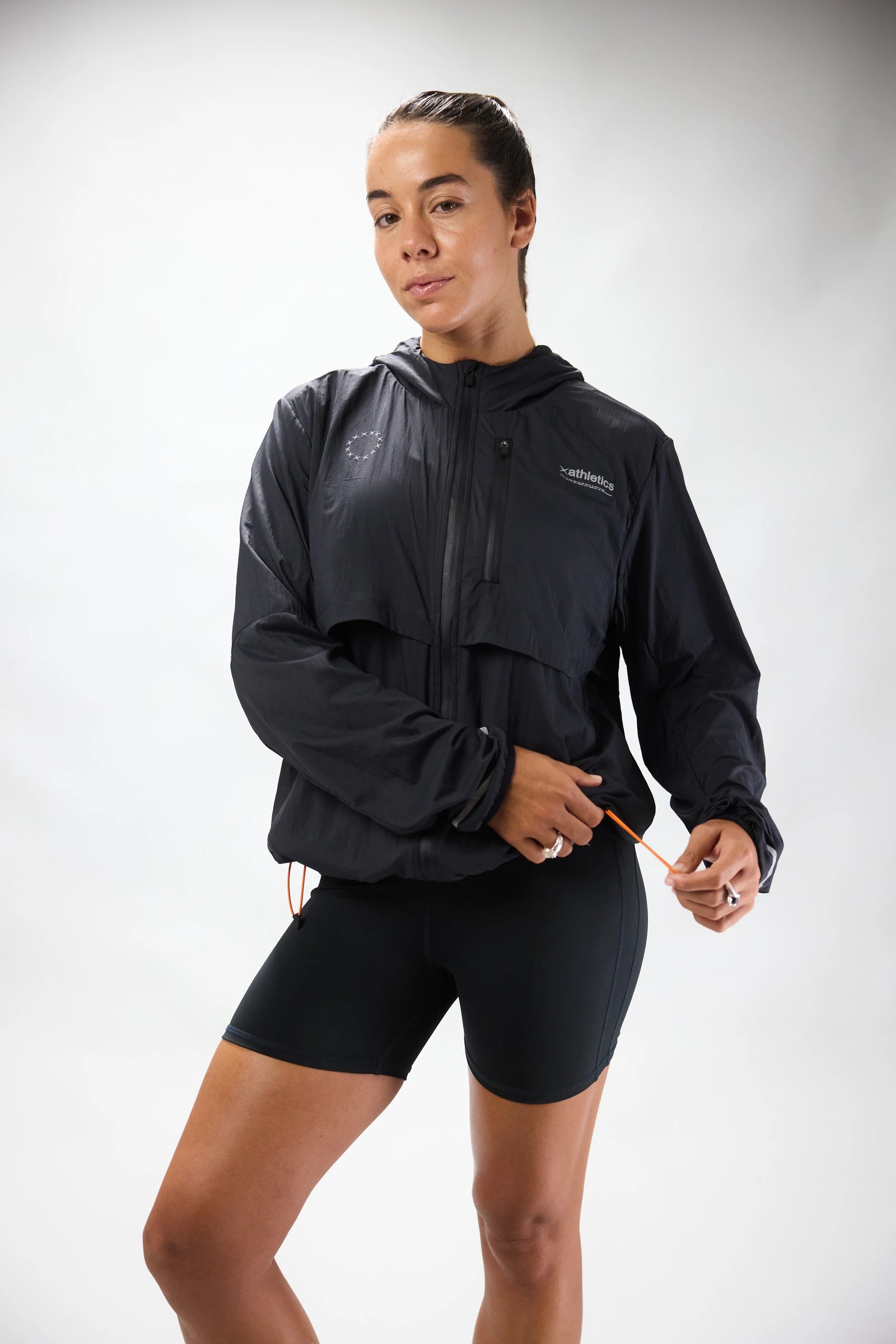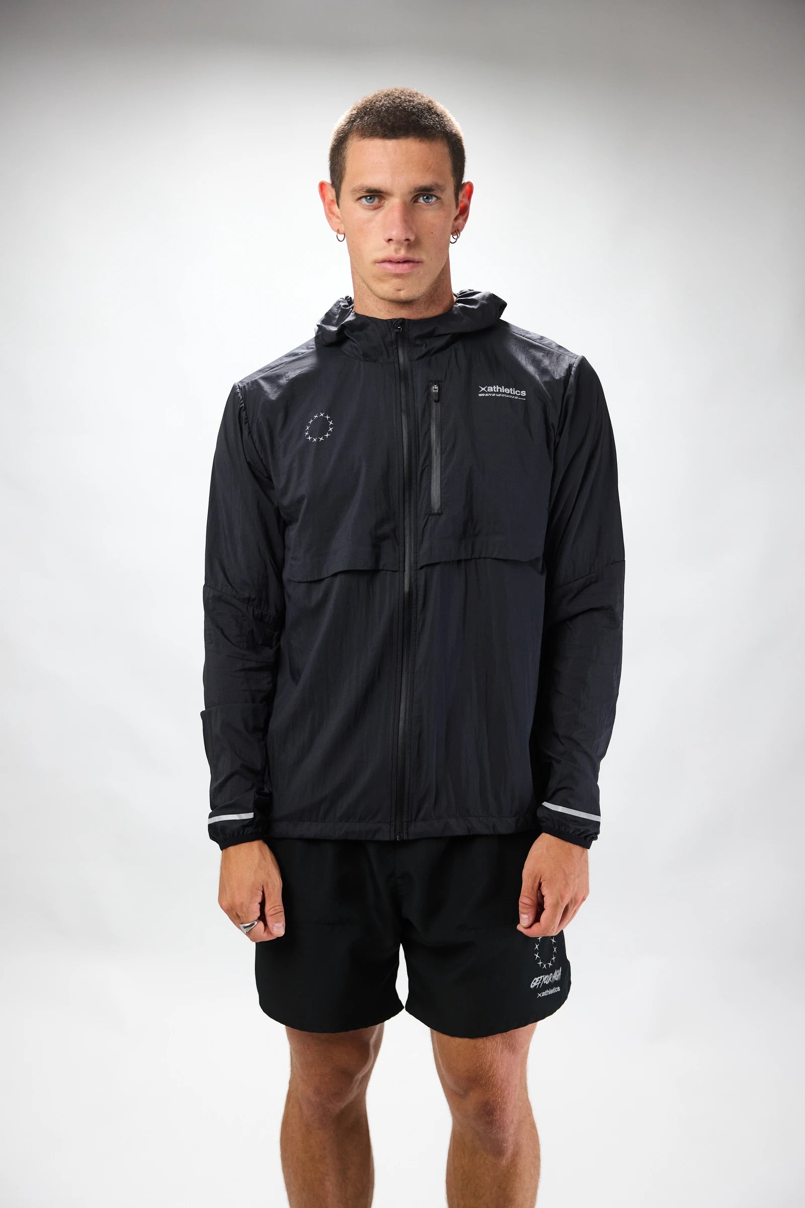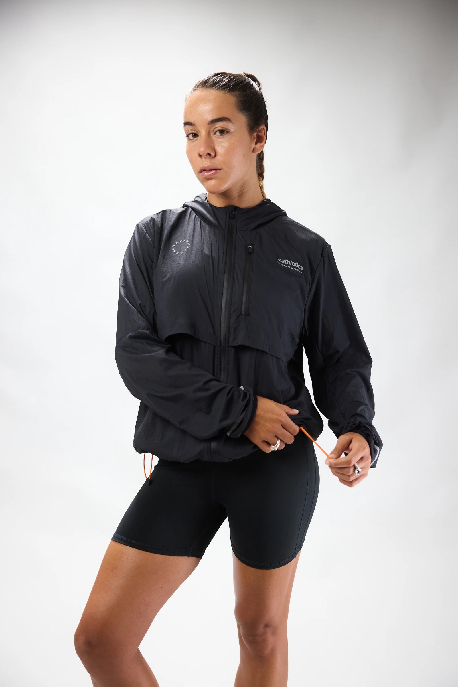 Windbreaker made from ultra-light nylon fabric, breathable, quick-dry, and UV50. Adjustable hood with visor. Reflective details for greater visibility. Zipped pocket on the left chest. Adjustable hem with elastic cord. Front and back ventilation openings.