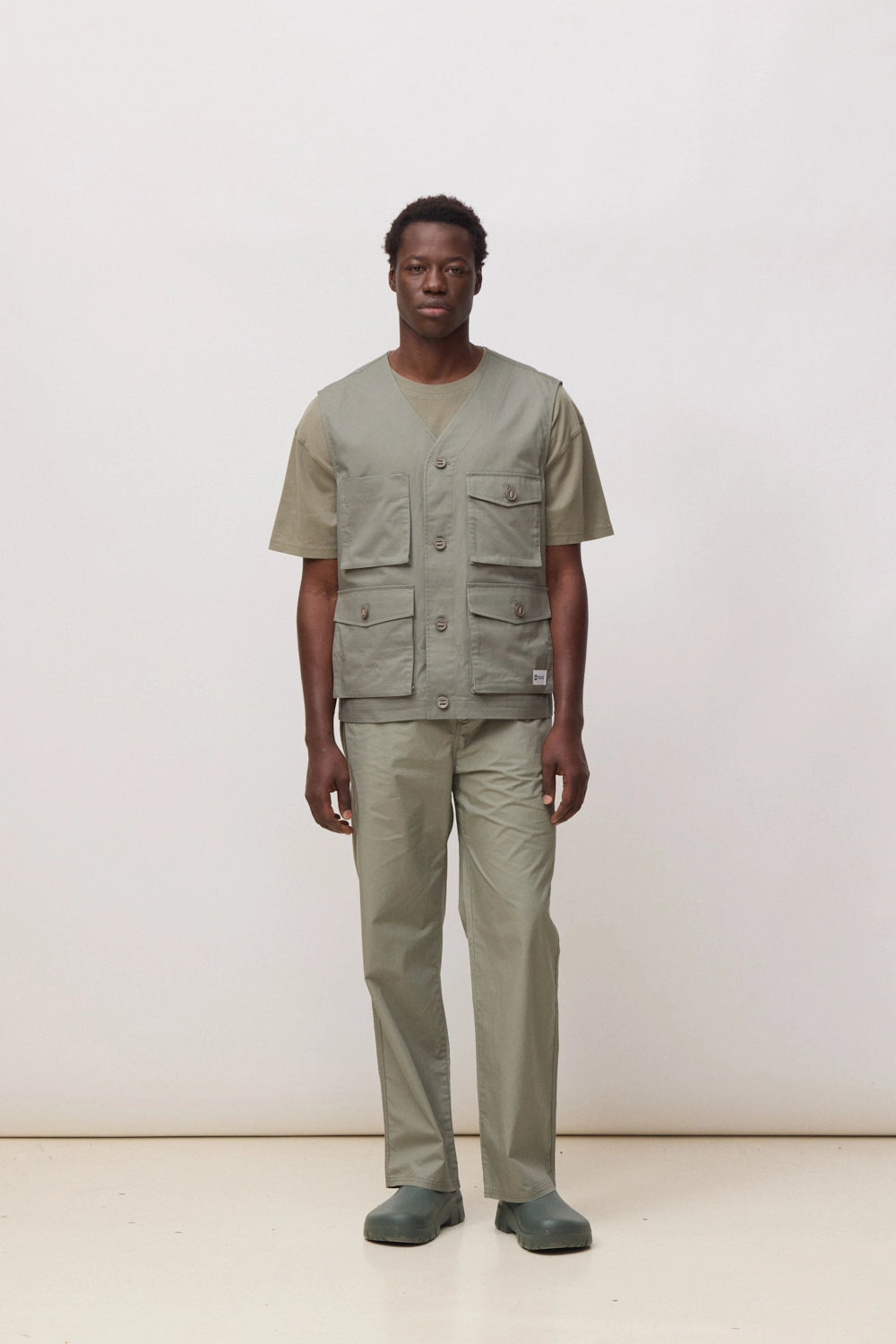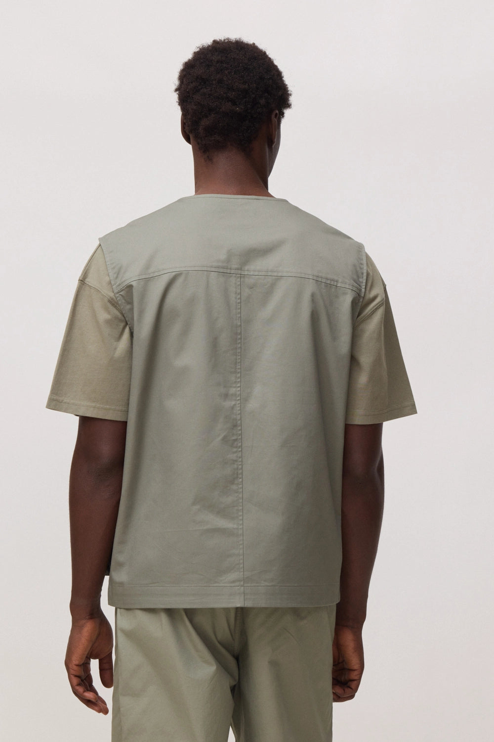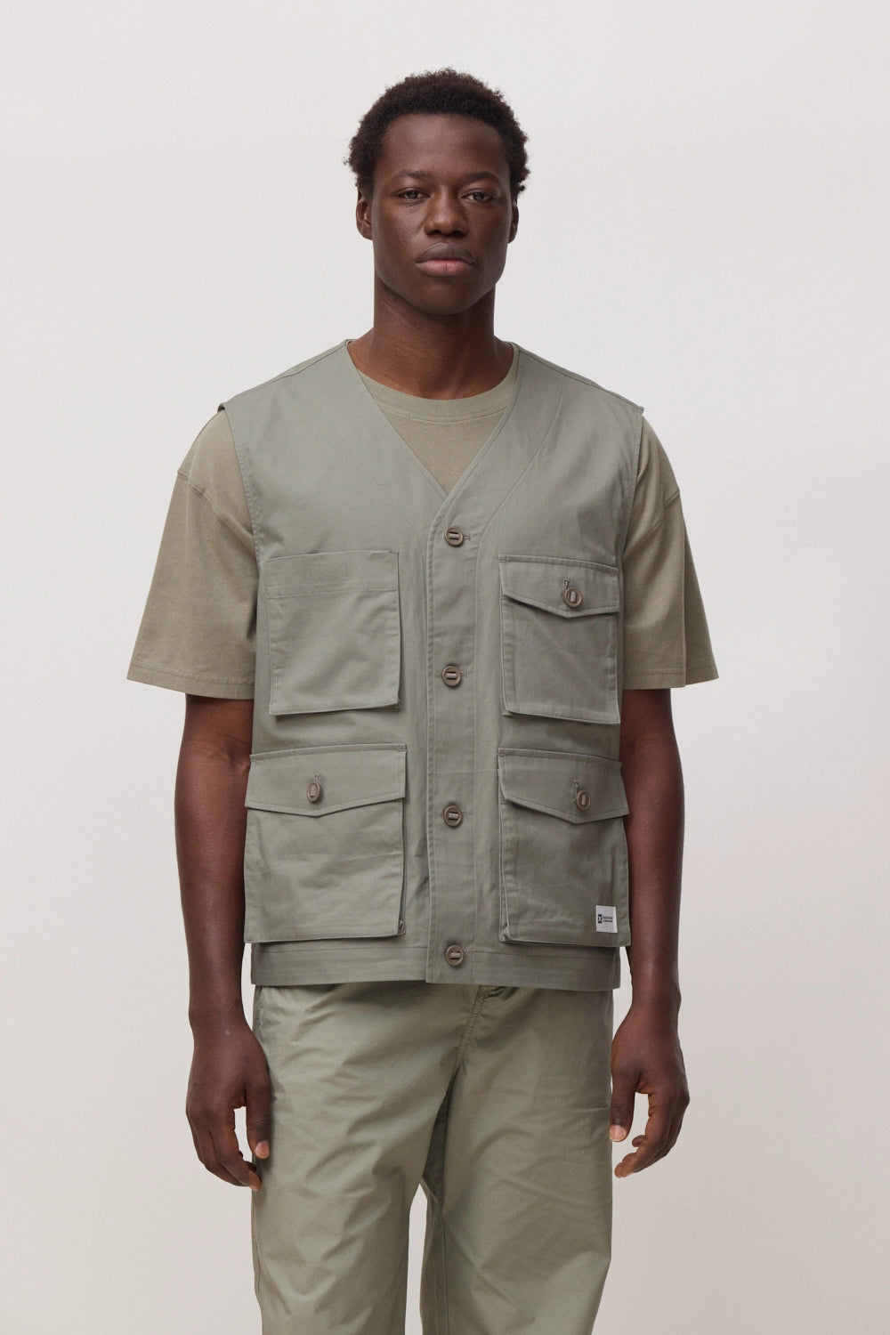 "Utility" multi-pocket vest. Four front flap pockets with matching buttons. Custom buttons in the same tone as the garment. Decorative label at the hem and back with central seam and yoke. Made from 100% cotton twill fabric. Regular fit with a weight of 265 GSM.