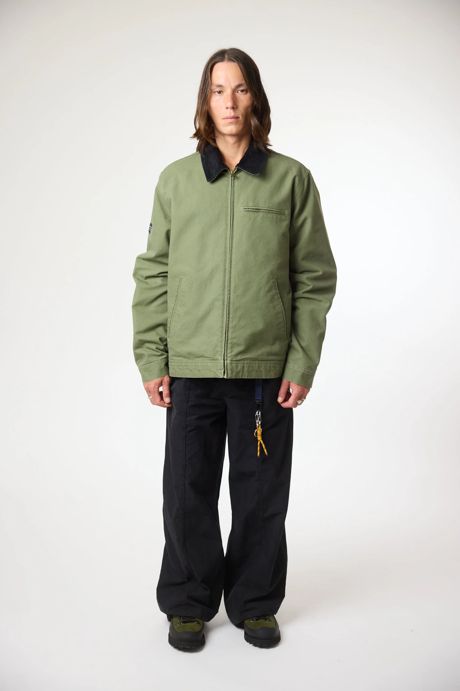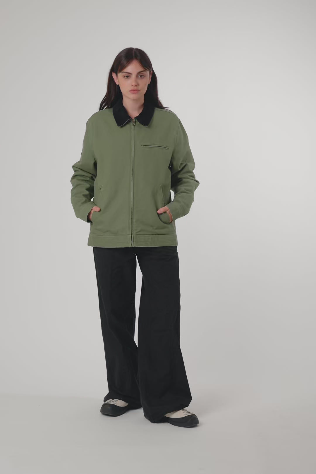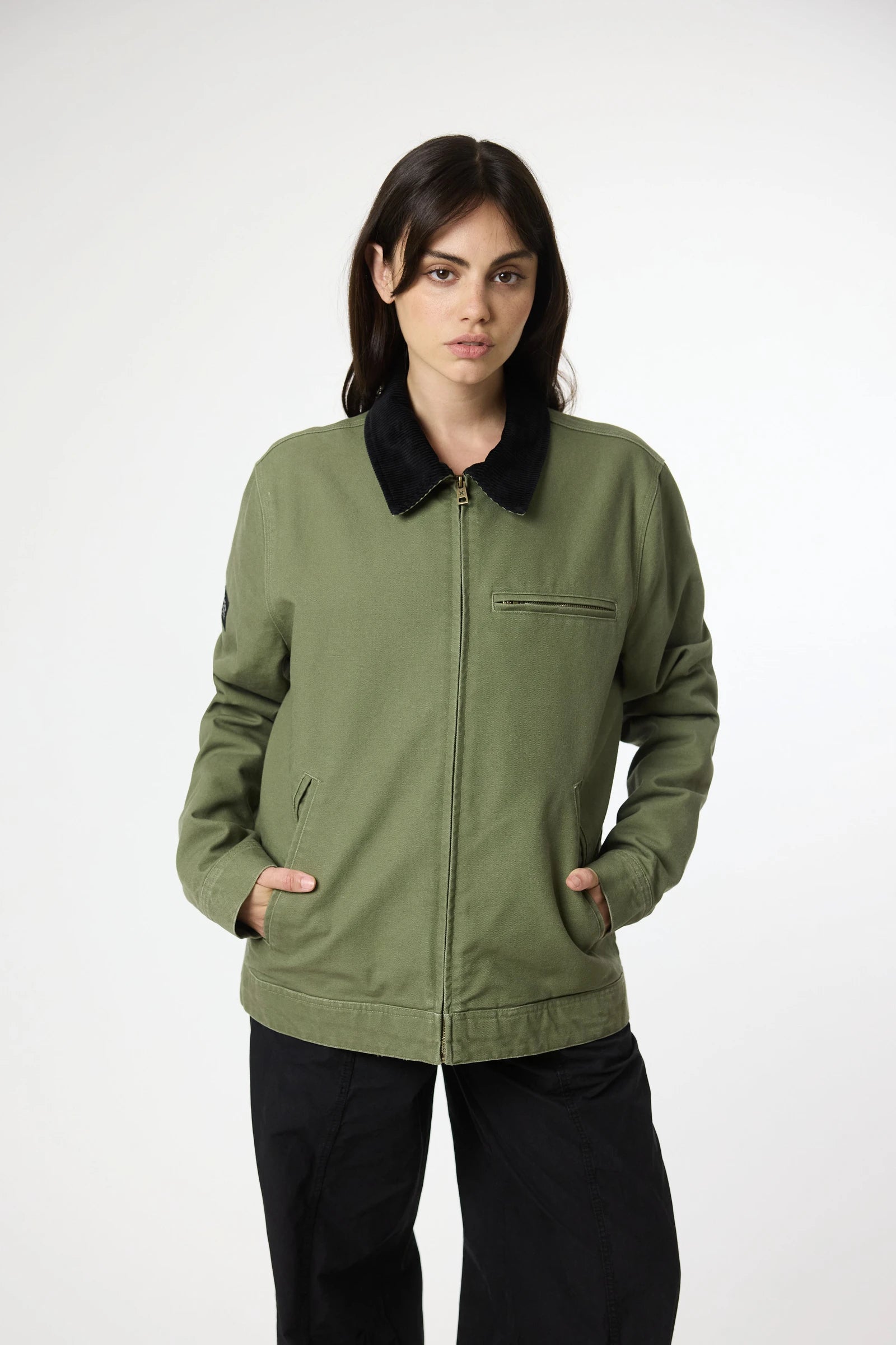 Washed jacket made of canvas fabric, 100% cotton, with contrasting corduroy collar. With zip pockets on the sides and chest. Also features a decorative label sewn on the sleeve.