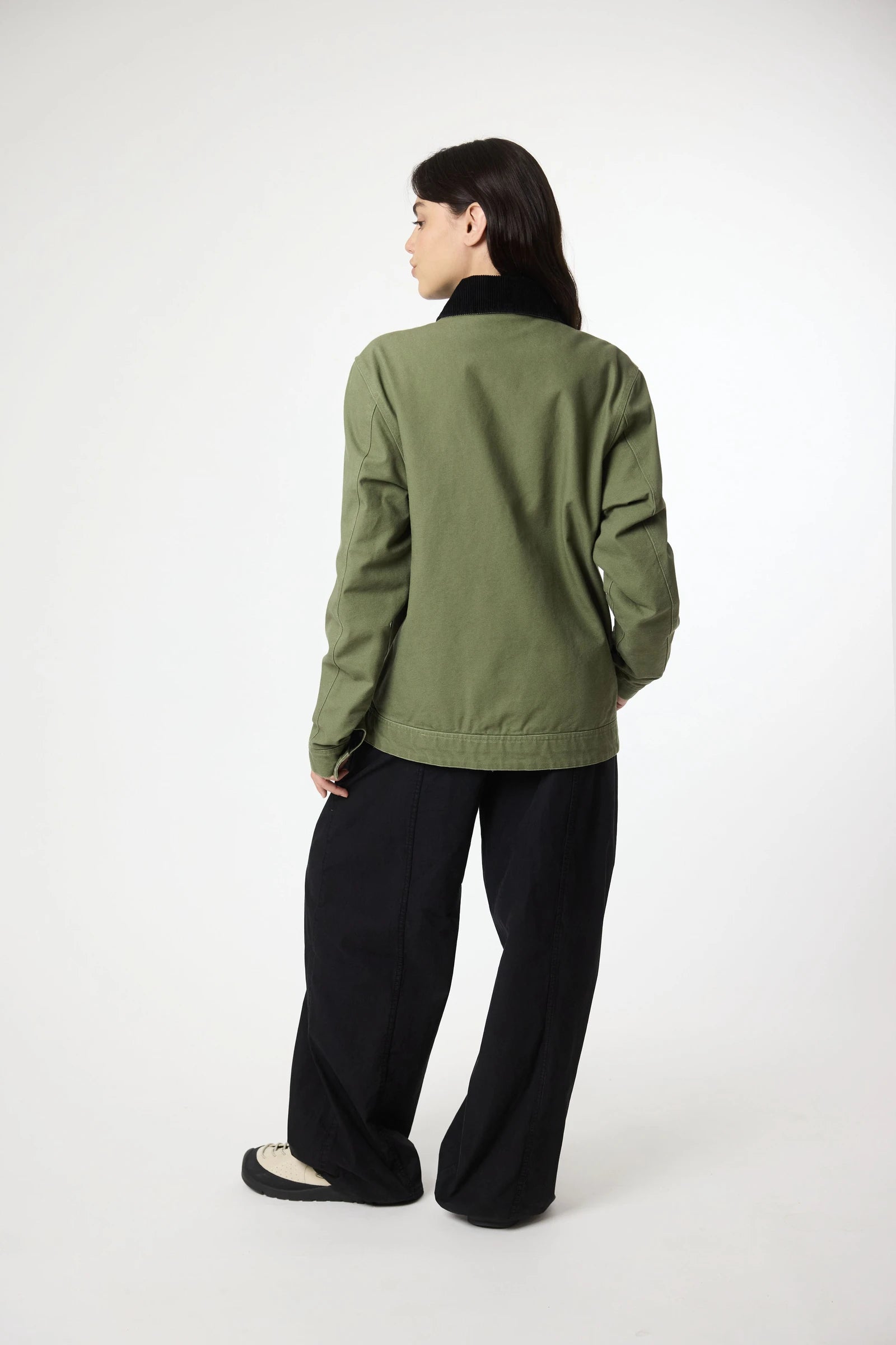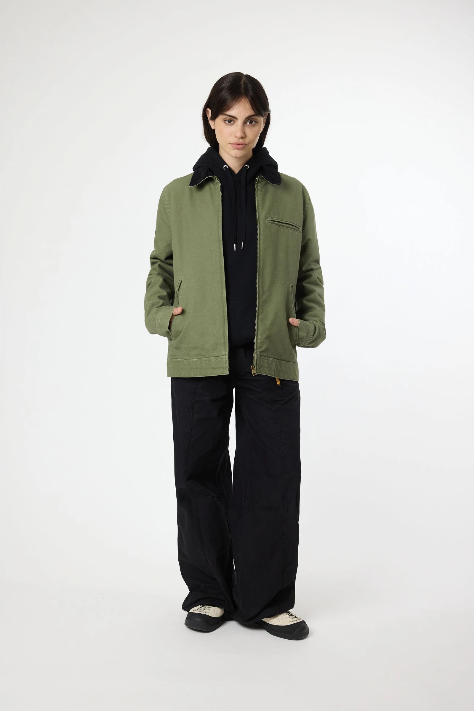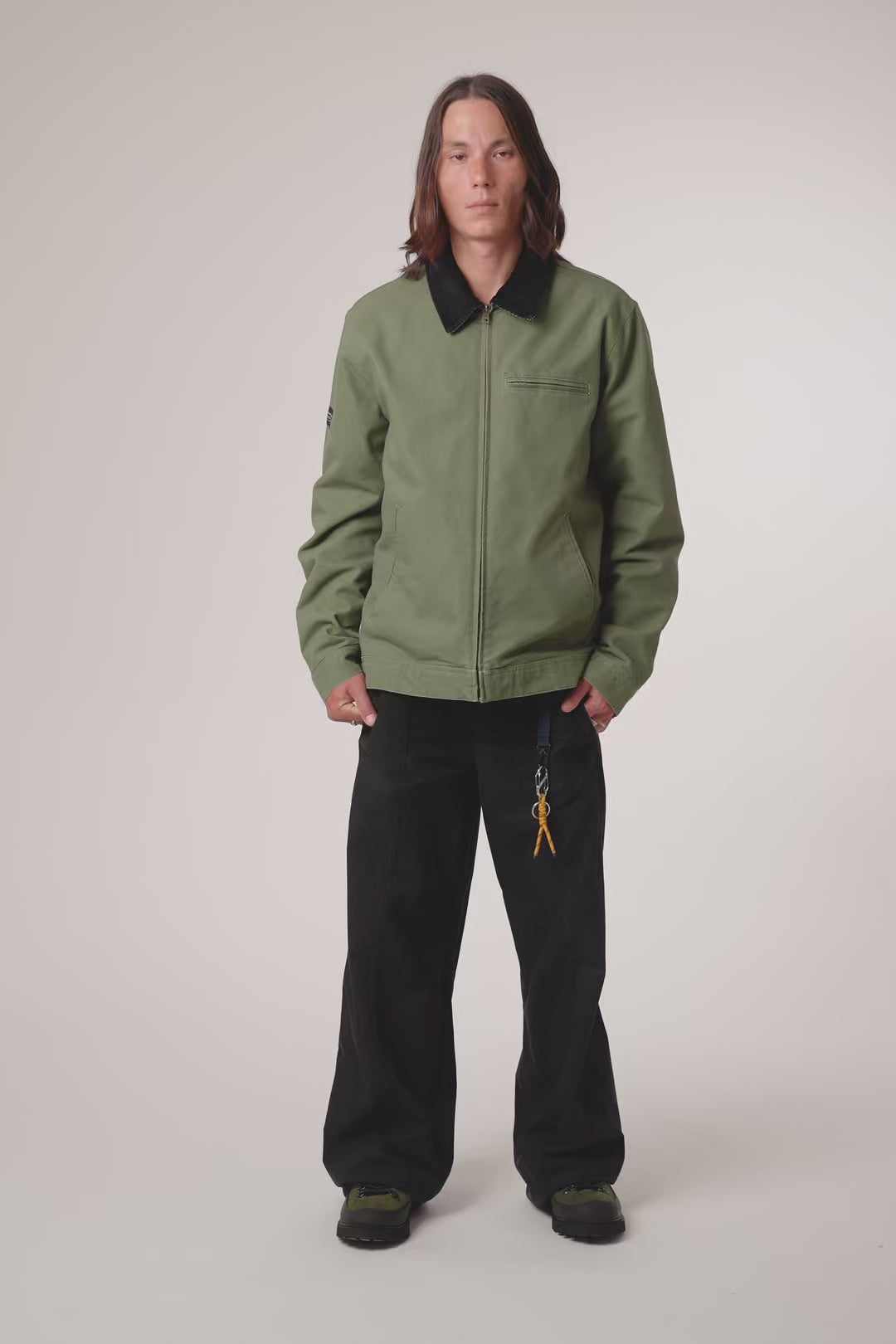 Washed jacket made of canvas fabric, 100% cotton, with contrasting corduroy collar. With zip pockets on the sides and chest. Also features a decorative label sewn on the sleeve.