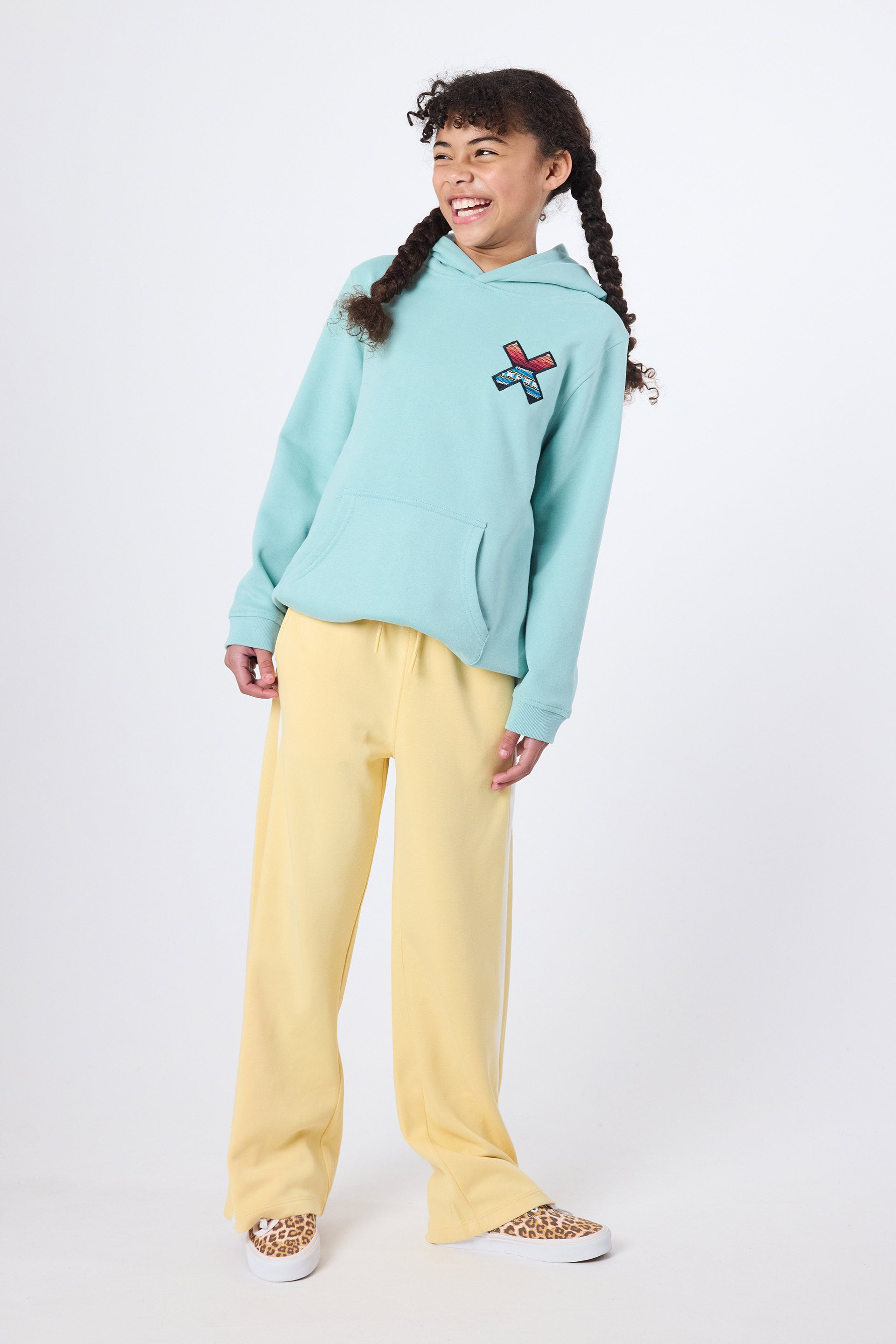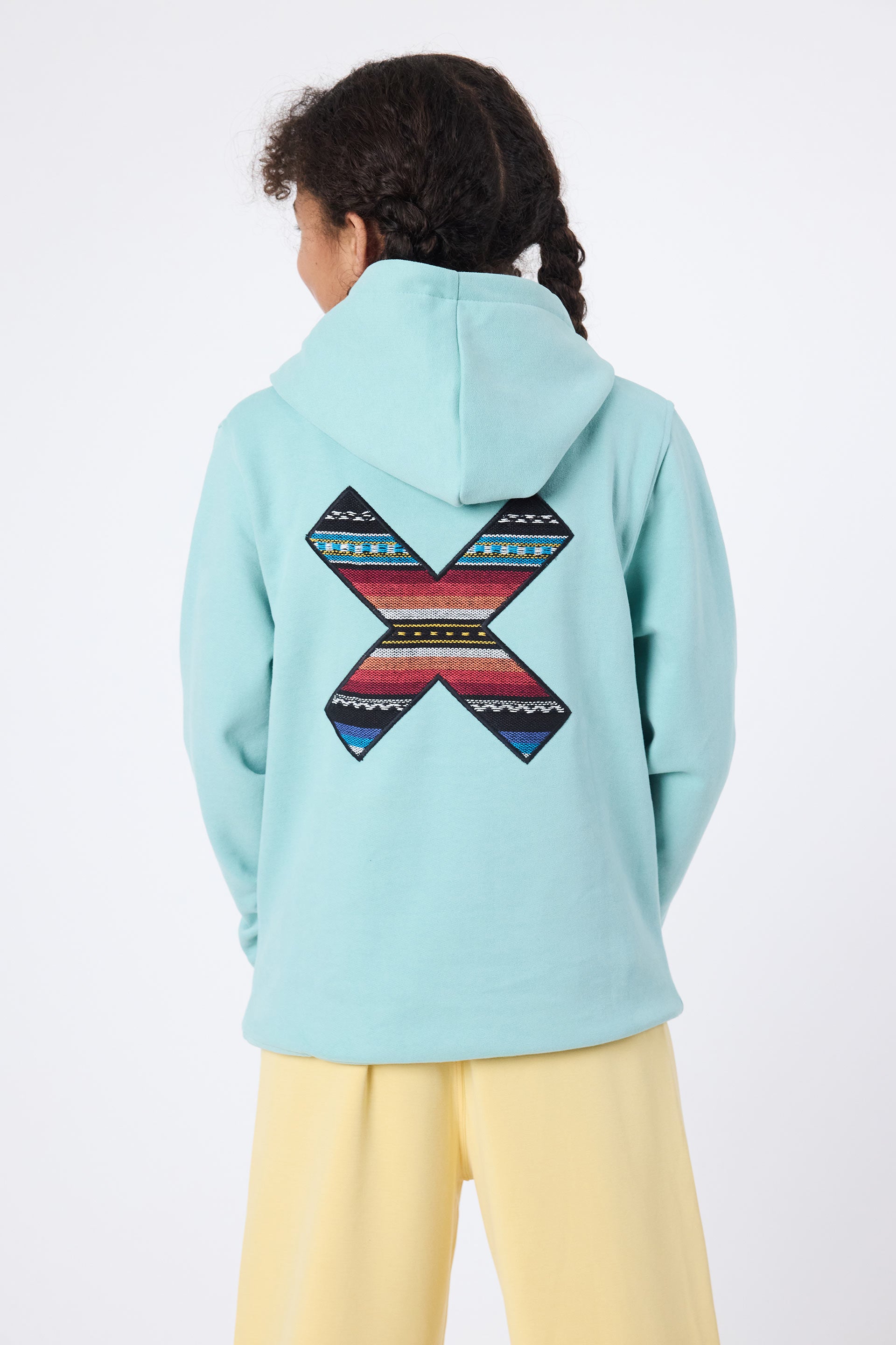 Hoodie mit unserem klassischen X bestickt: Vorderseite auf der Brust und Rückseite auf dem Rücken. Hergestellt aus 100% Bio-Baumwolle.