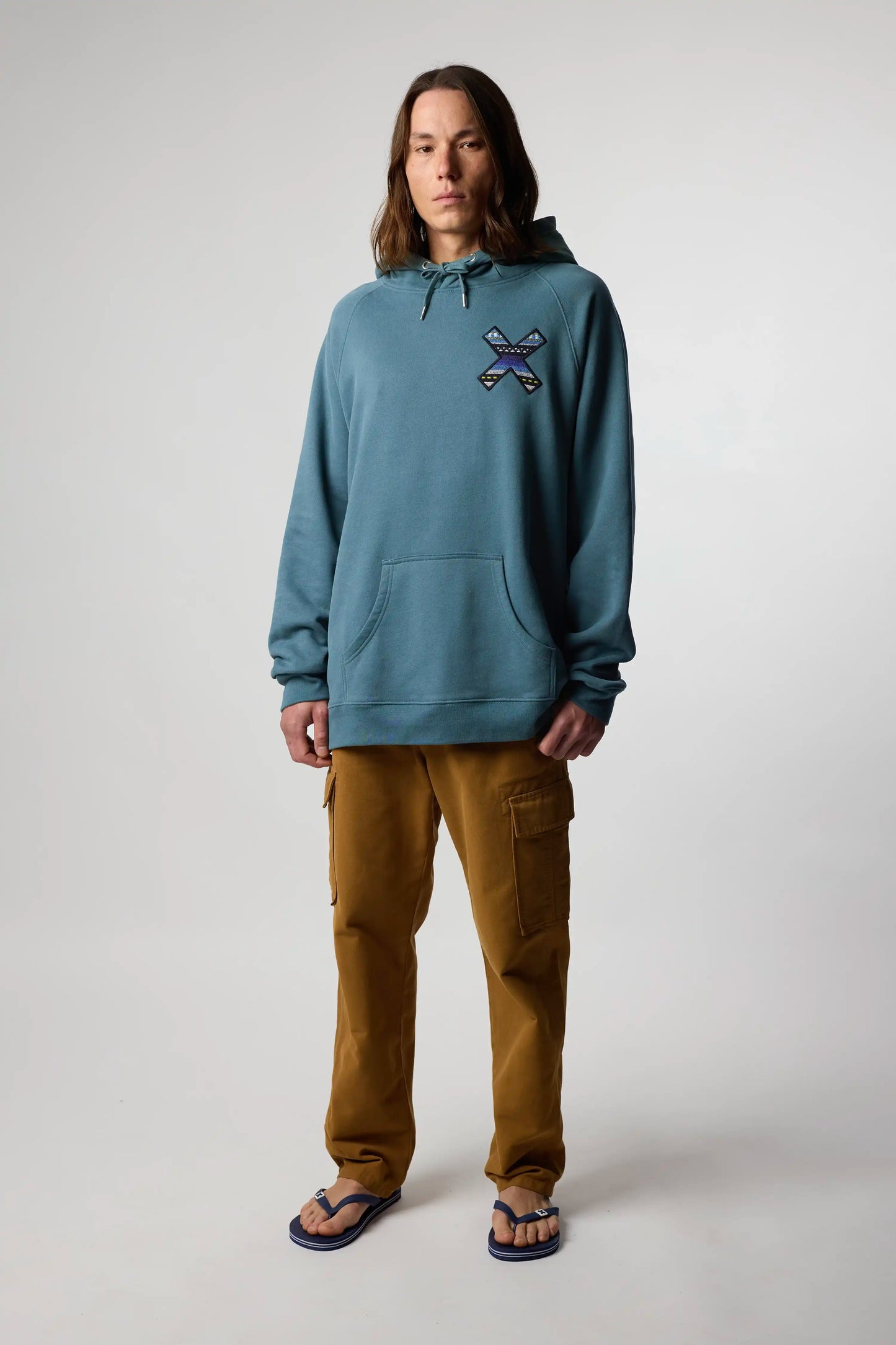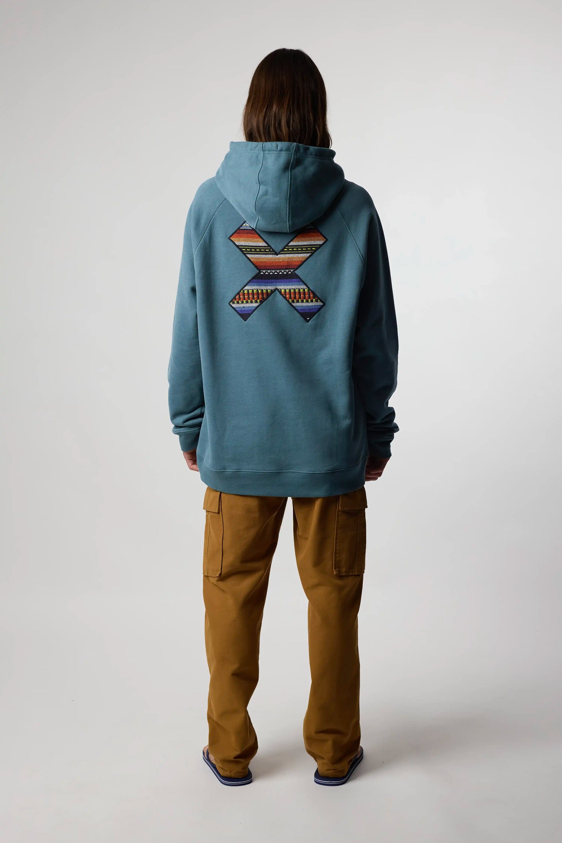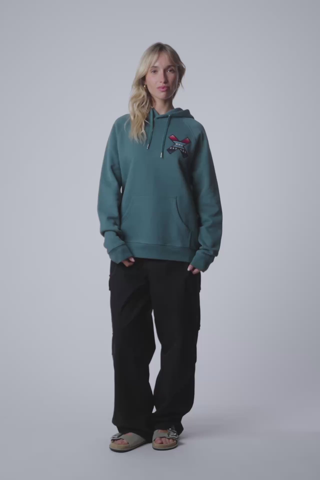 Sudadera con capucha con nuestra clásica X bordada: delantera en el pecho y trasera en la espalda. Confeccionada con 100% algodón orgánico y corte regular fit.