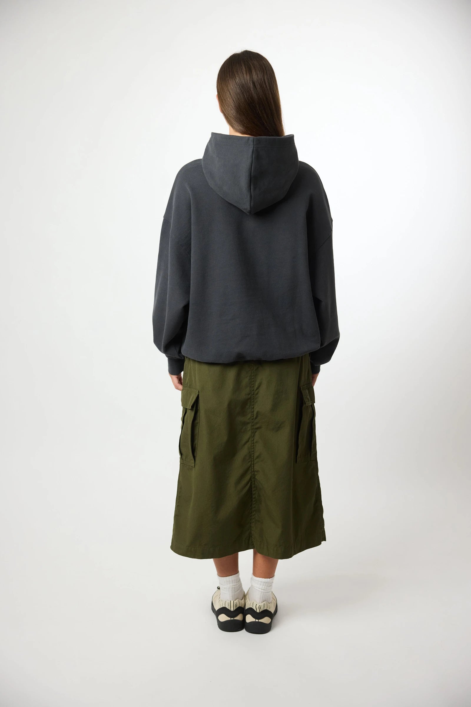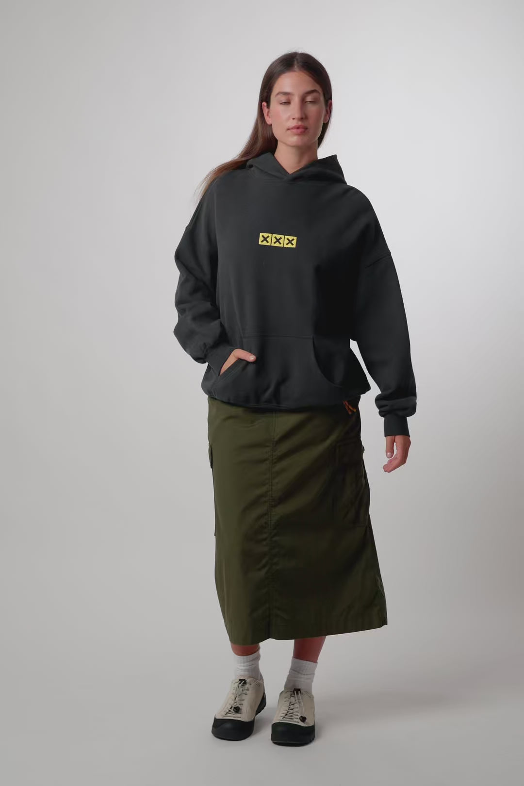 Hoodie mit Frontprint in der Mitte. Hergestellt aus 100% Bio-Baumwolle, Boxy Fit.