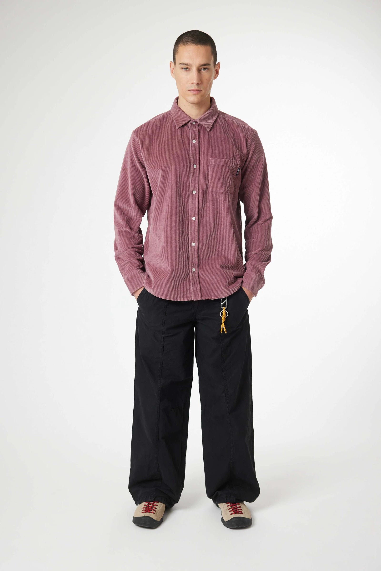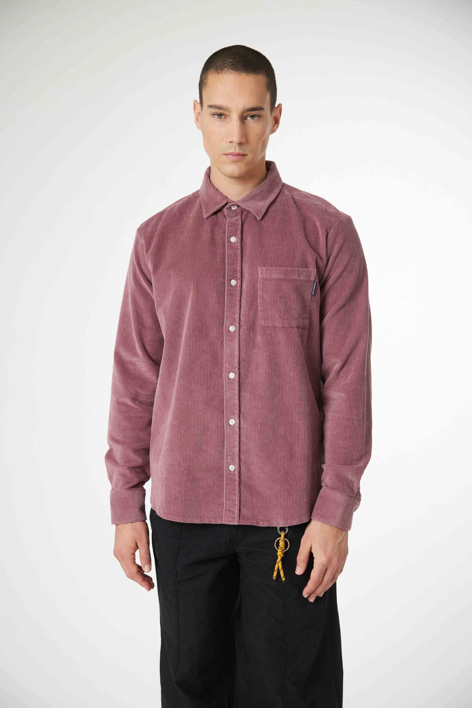 Langarm-Overshirt aus Baumwollcord. Lockerer Schnitt. Eine aufgesetzte Brusttasche. Personalisierte Knöpfe. Branding-Etikett an der Vordertasche.