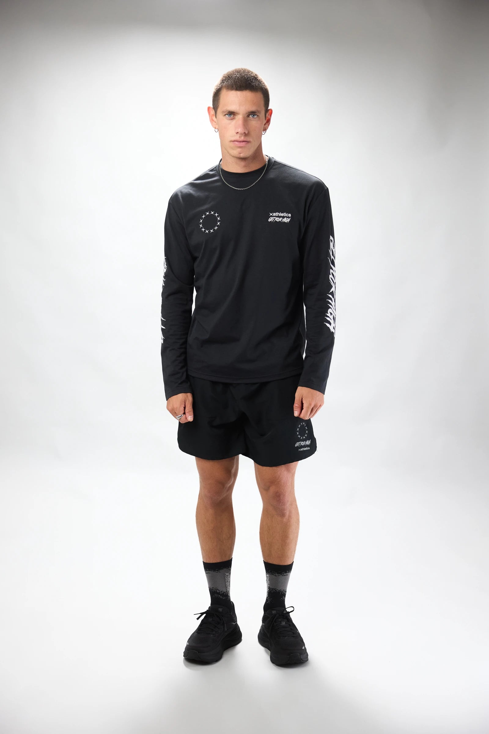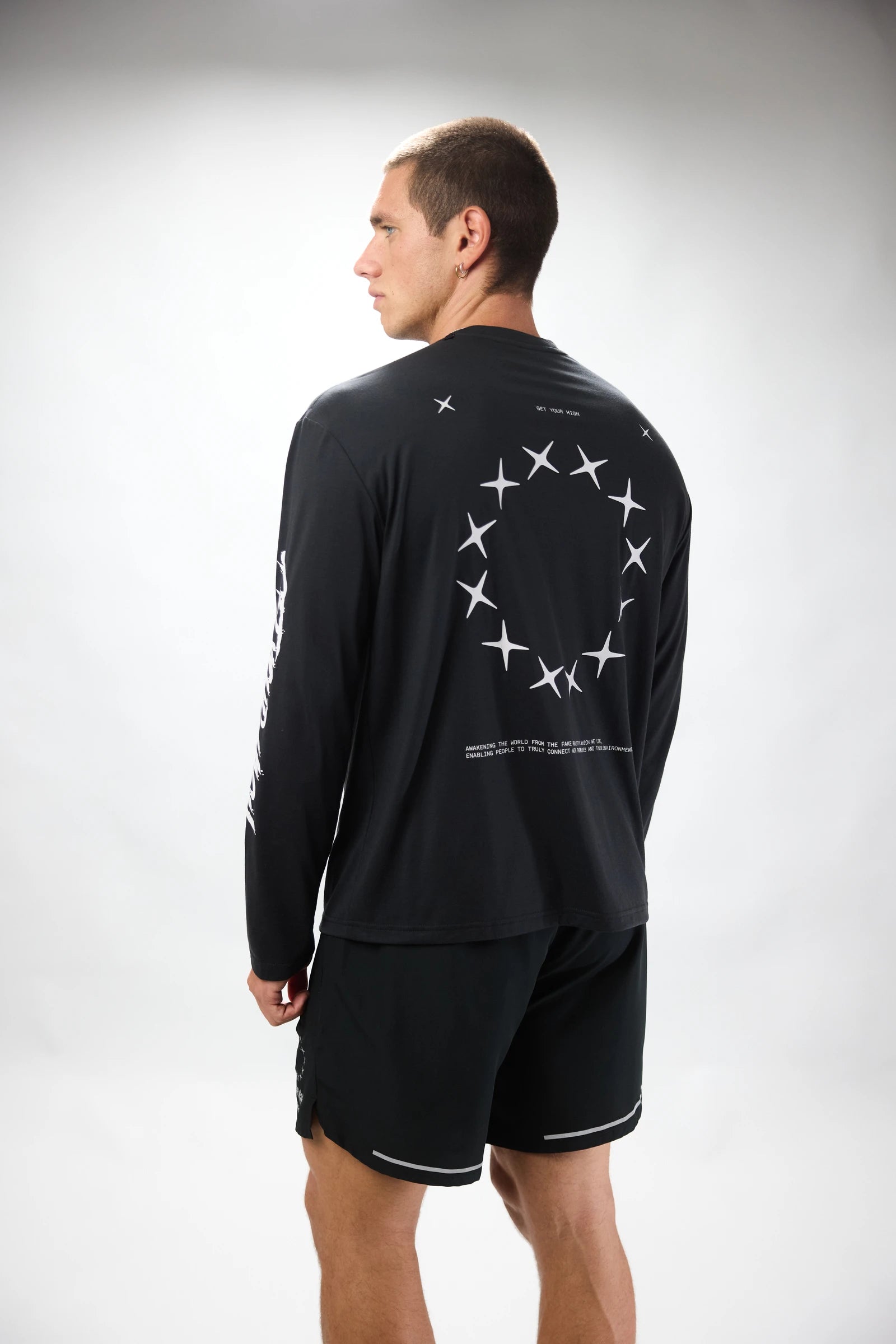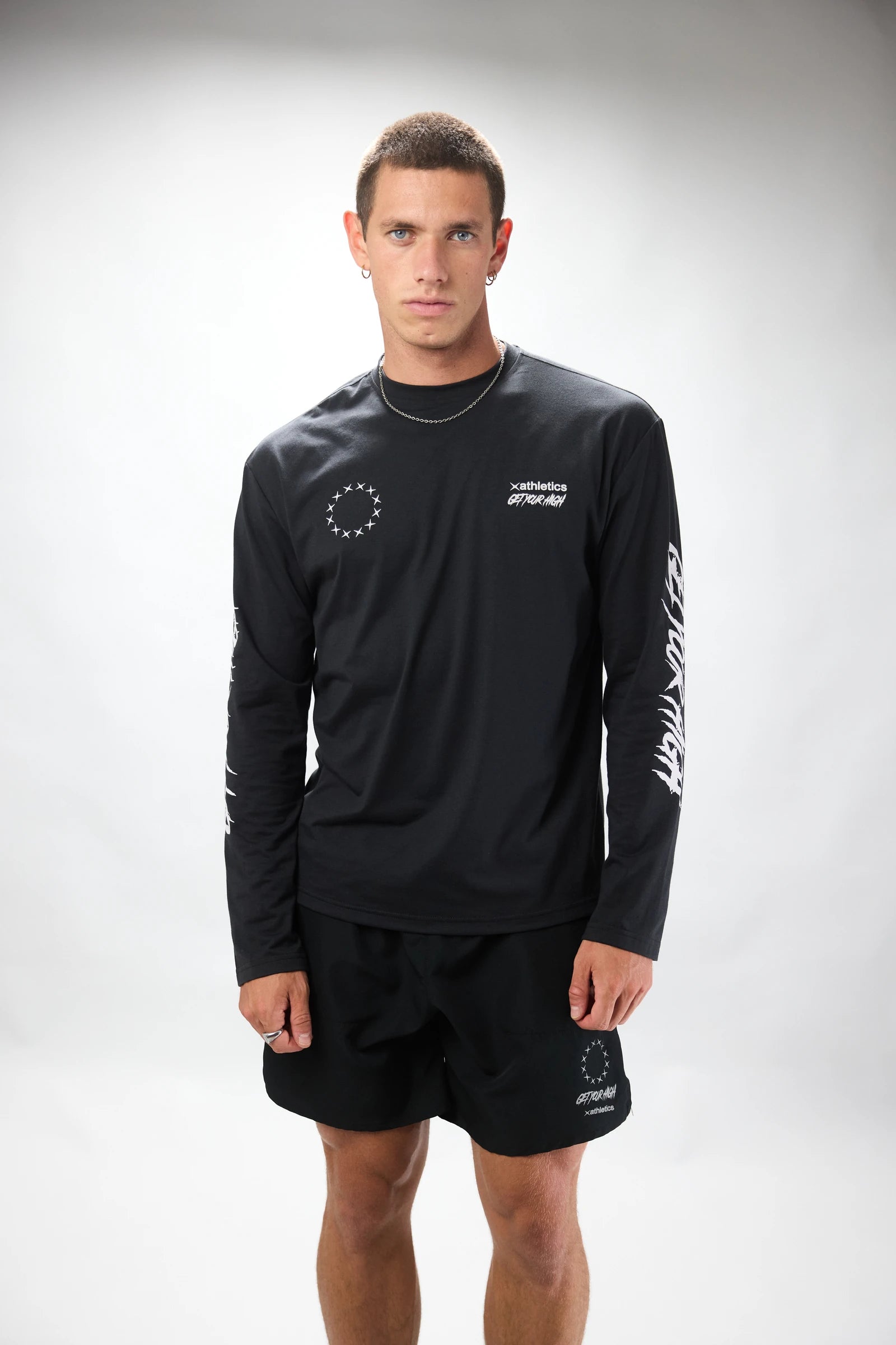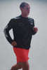 Langes Sportshirt mit Ärmeln aus Baumwolle und Polyester. Front- und Rückendruck in der Mitte.