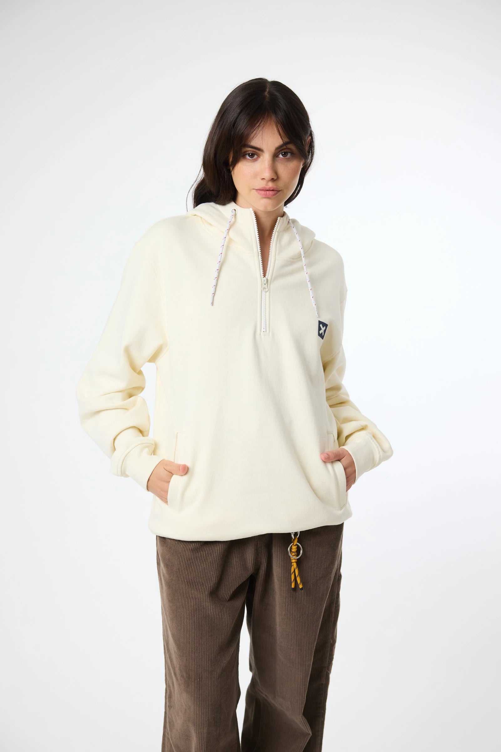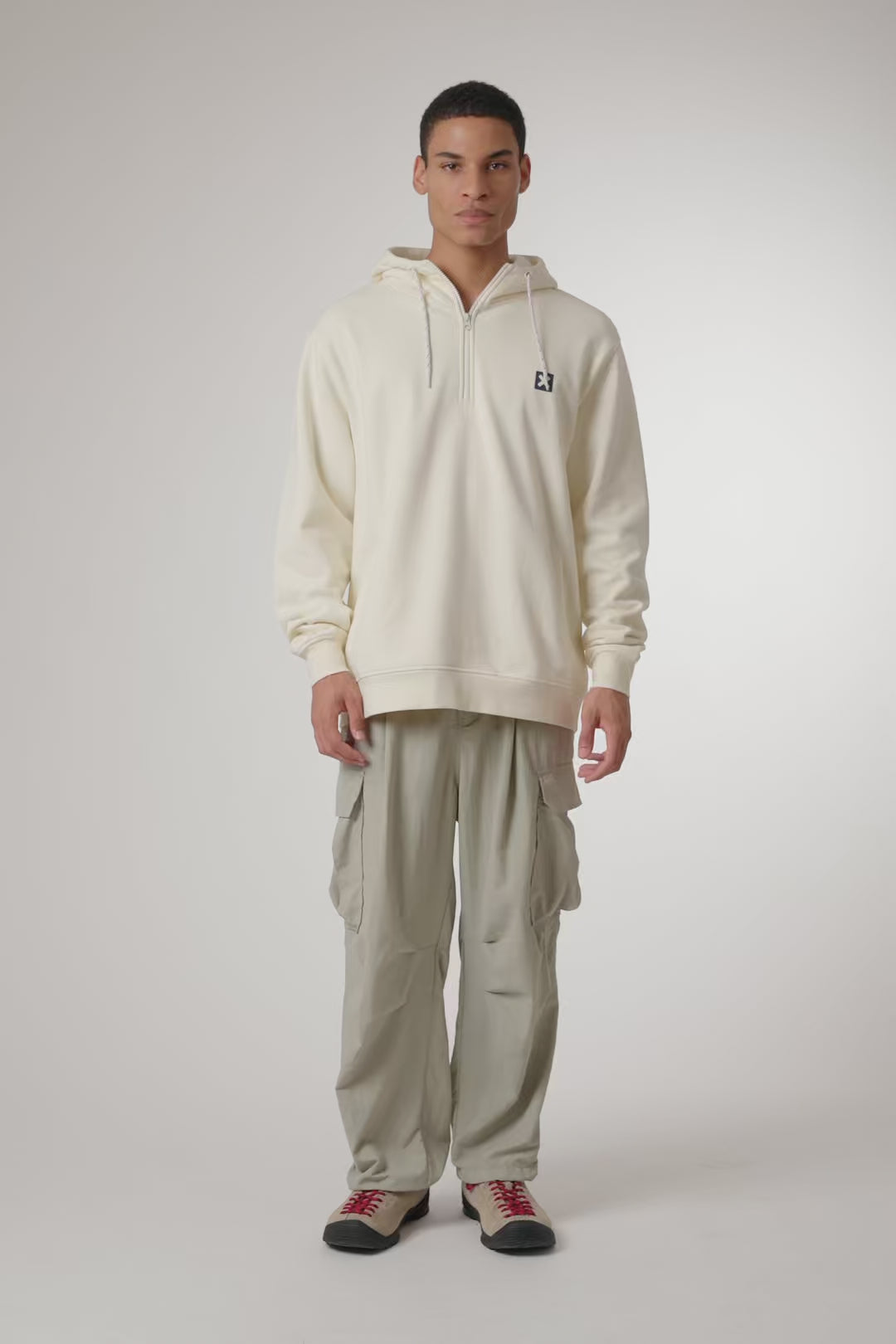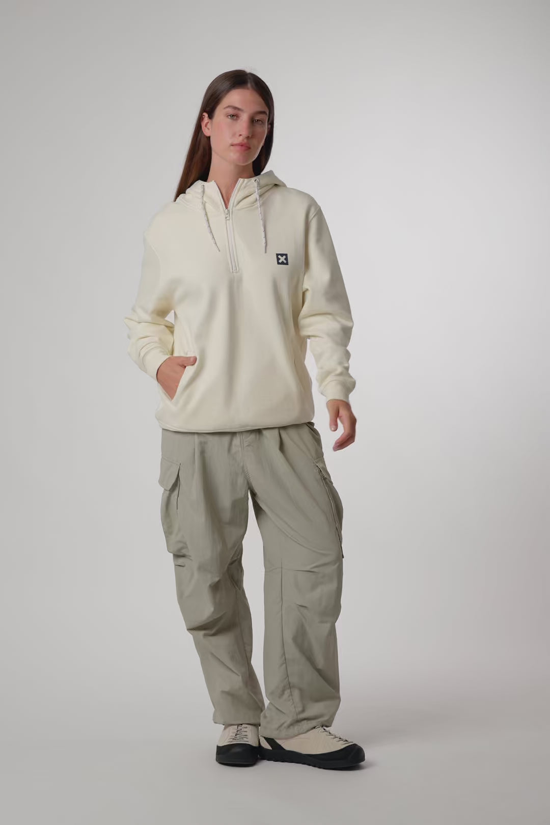Hoodie mit Frontprint und Reißverschluss am Kragen. Vordere Kängurutasche mit seitlichem Eingriff. Hergestellt aus 100% Bio-Baumwolle und Regular-Fit.