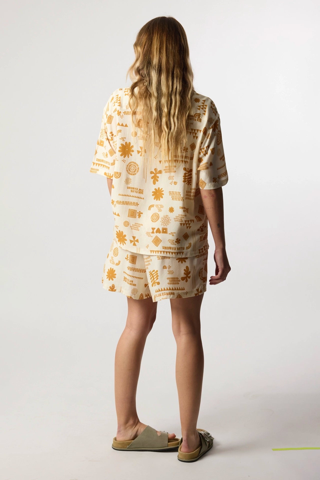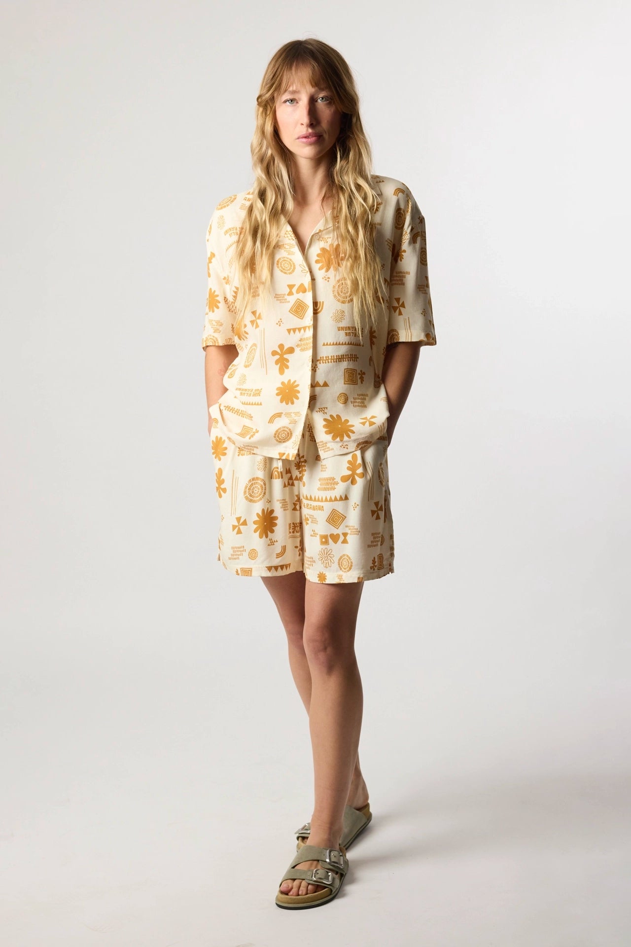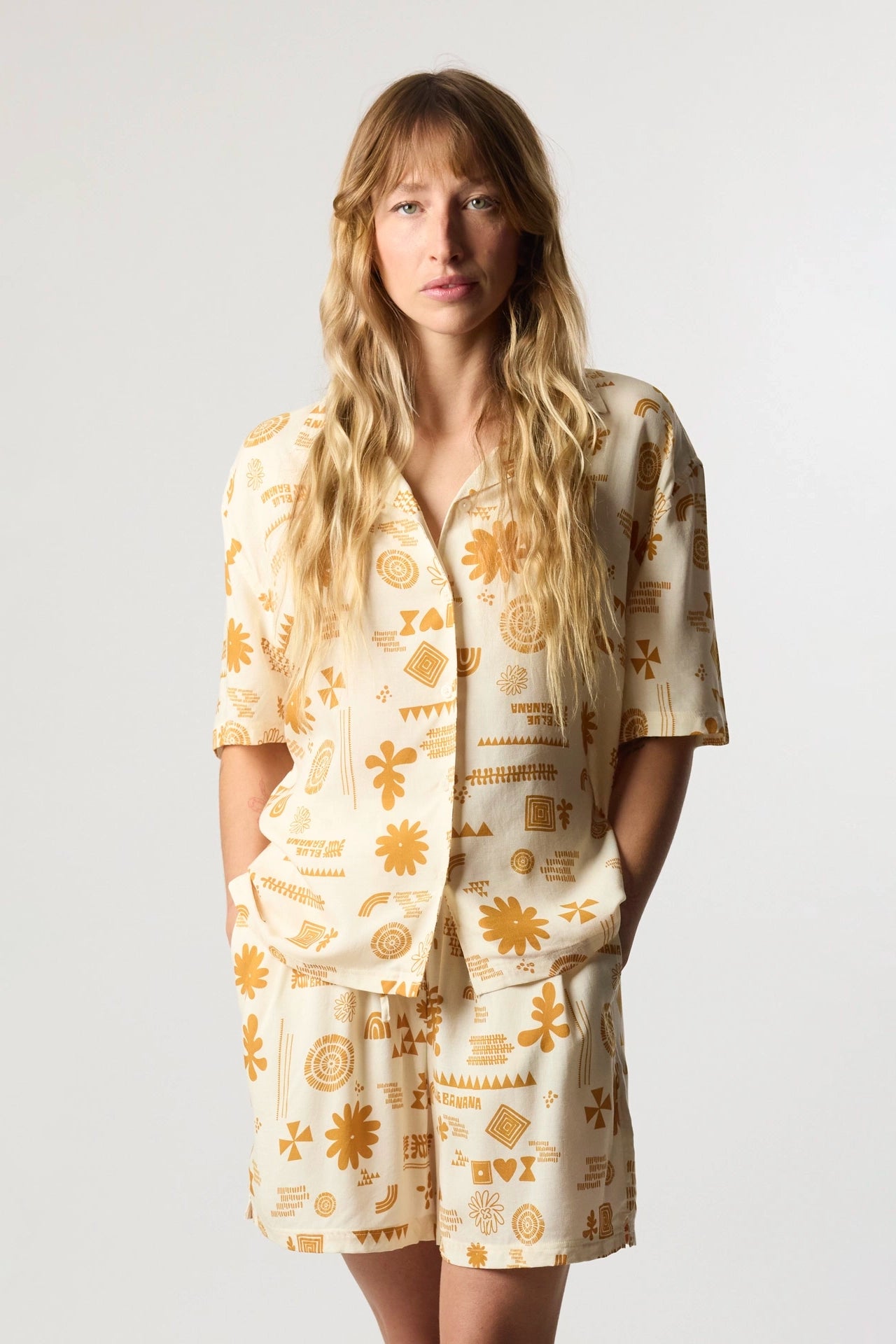 Camisa fluida de manga corta estampada. Confeccionada con 100% rayon. Cierre frontal con botones. Cuello camp. Etiqueta en el lateral izquierdo.