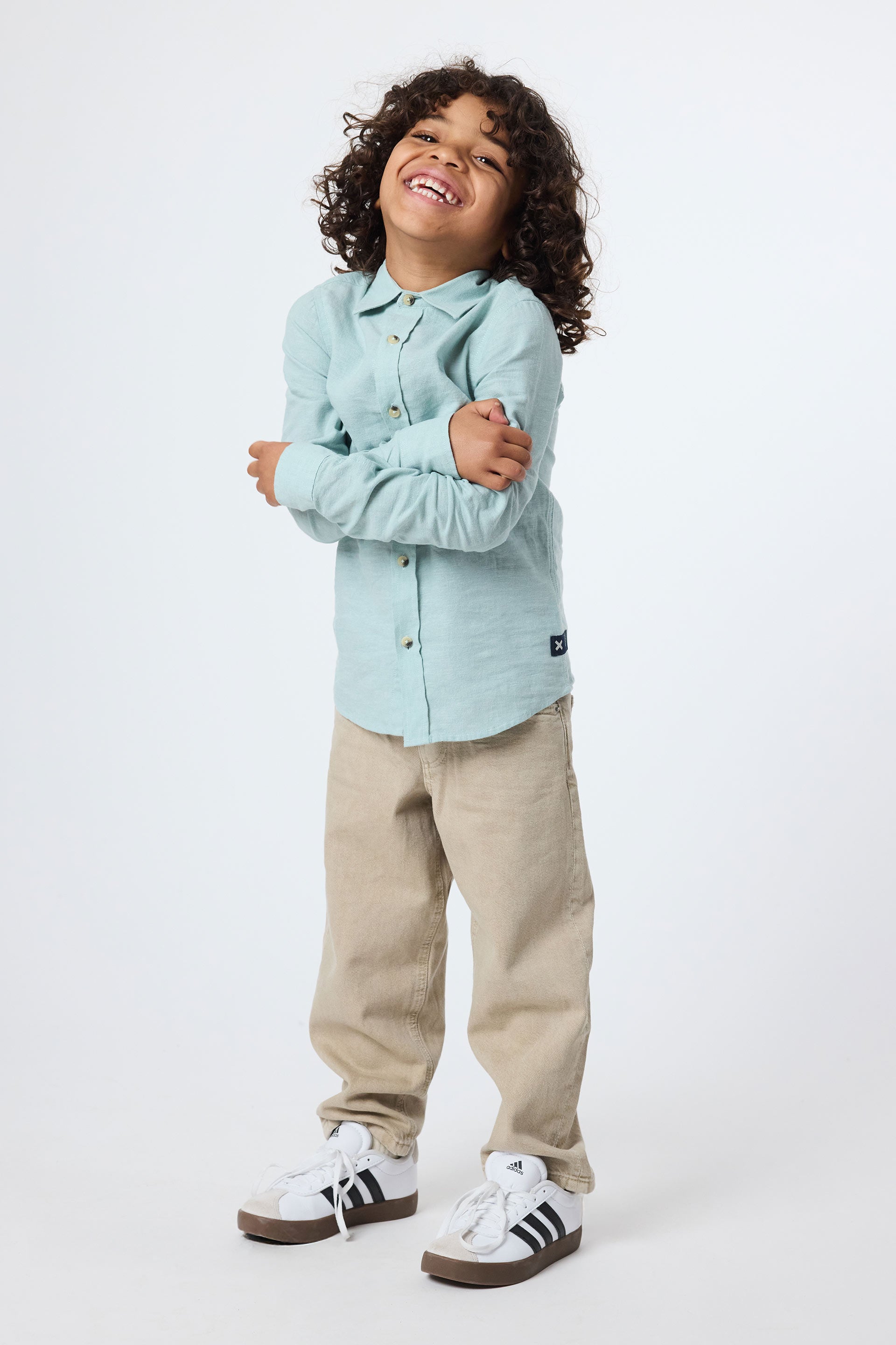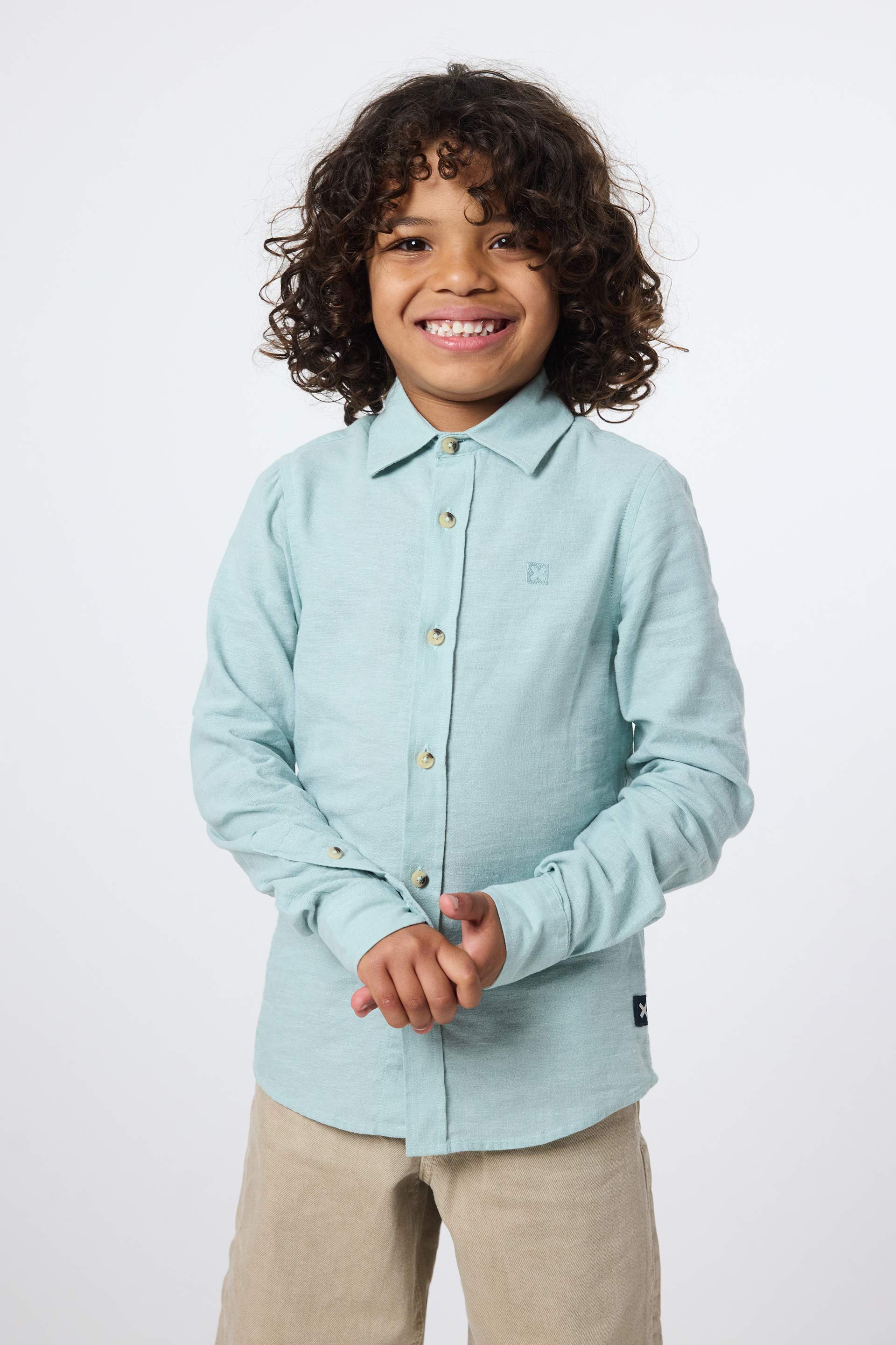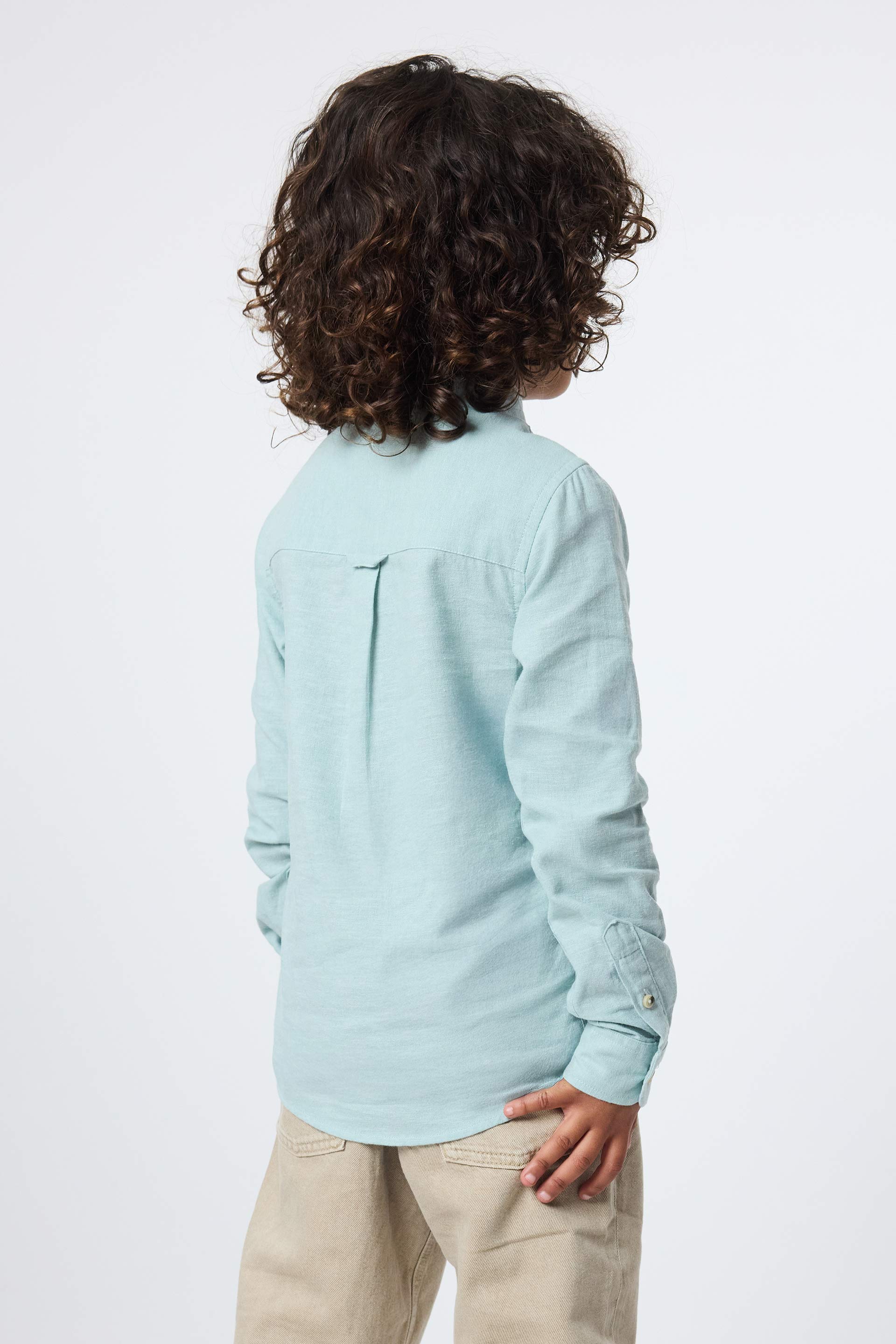 Camisa confeccionada con lino y algodón. Etiqueta con bordado en la parte inferior izquierda. Bordado a tono en pecho. Botones personalizados. Tapacosturas a contraste.