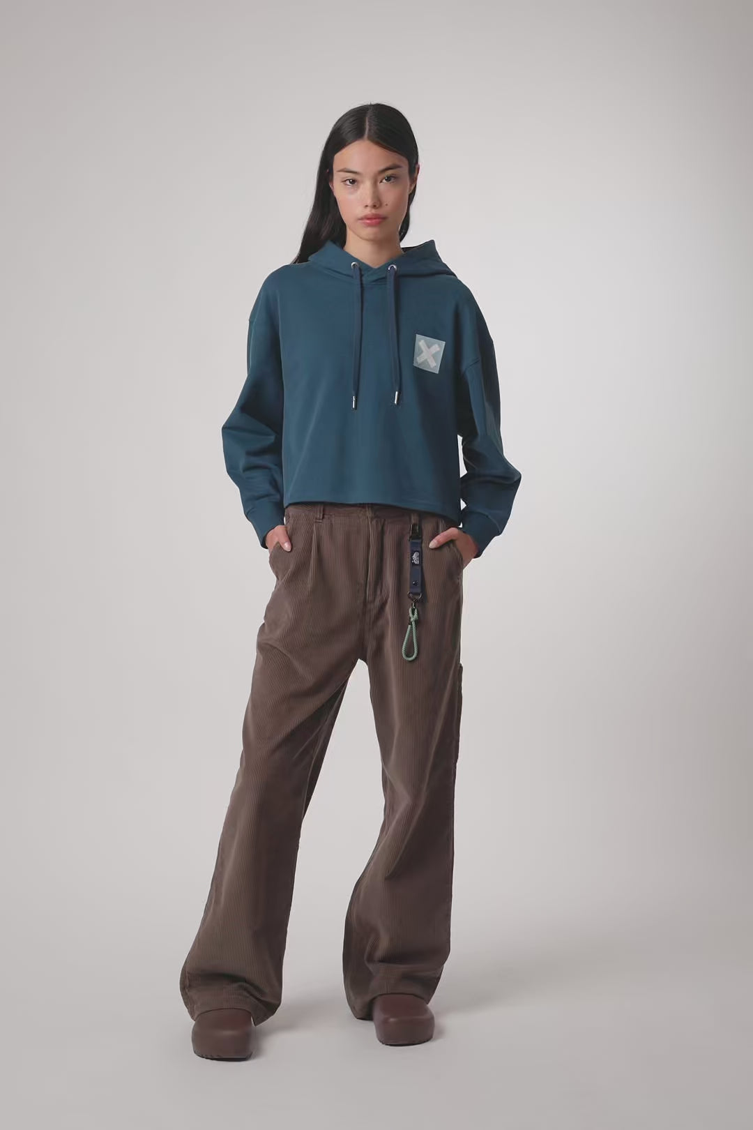 Hoodie mit Front- und Rückenprint. Hergestellt aus 100% Bio-Baumwolle und Cropped-Schnitt.