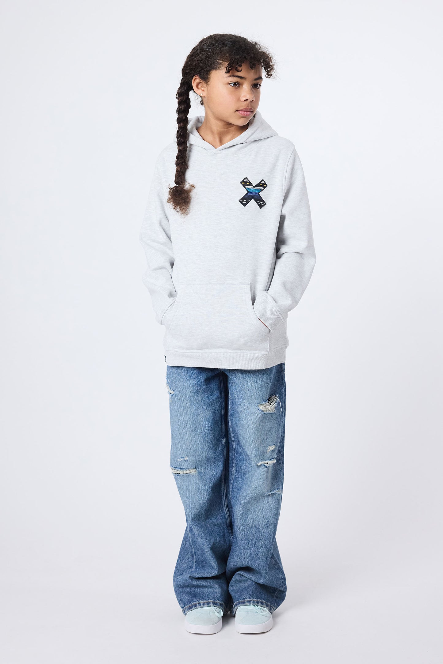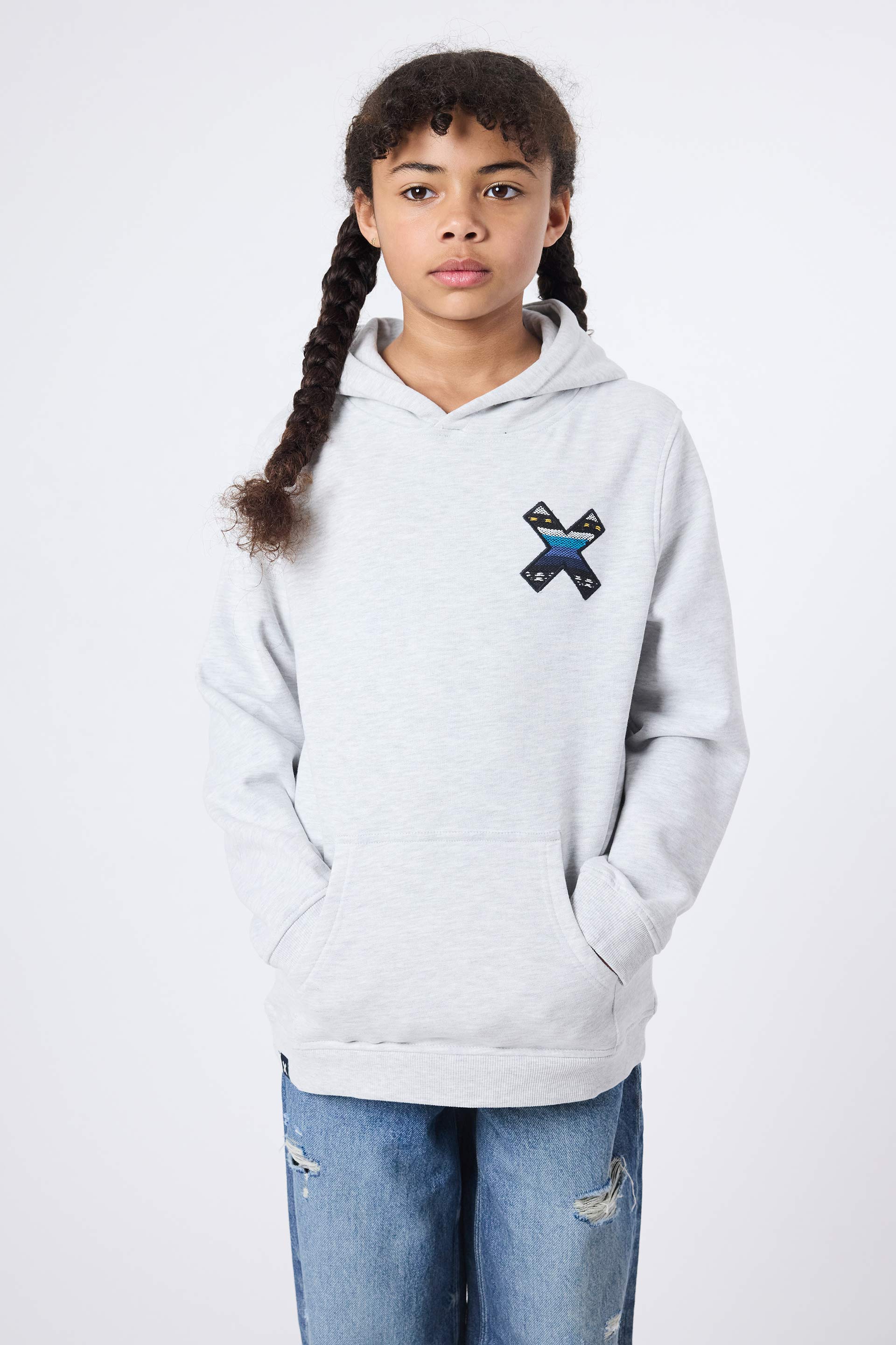 Hoodie mit unserem klassischen X-Stickerei: Vorderseite auf der Brust und Rückseite auf dem Rücken. Untere mittige Vordertasche mit Öffnung auf beiden Seiten. Hergestellt aus 100% Bio-Baumwolle.