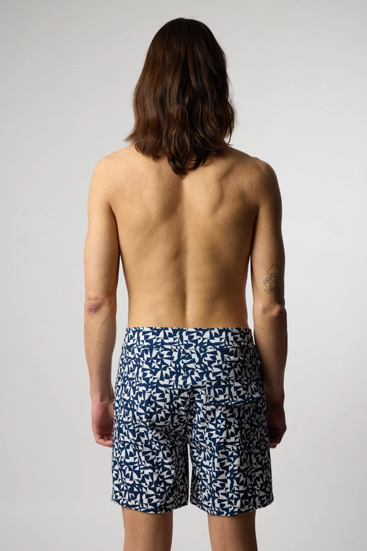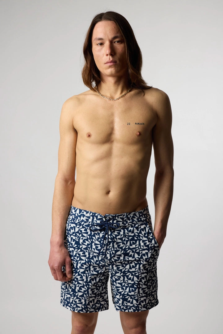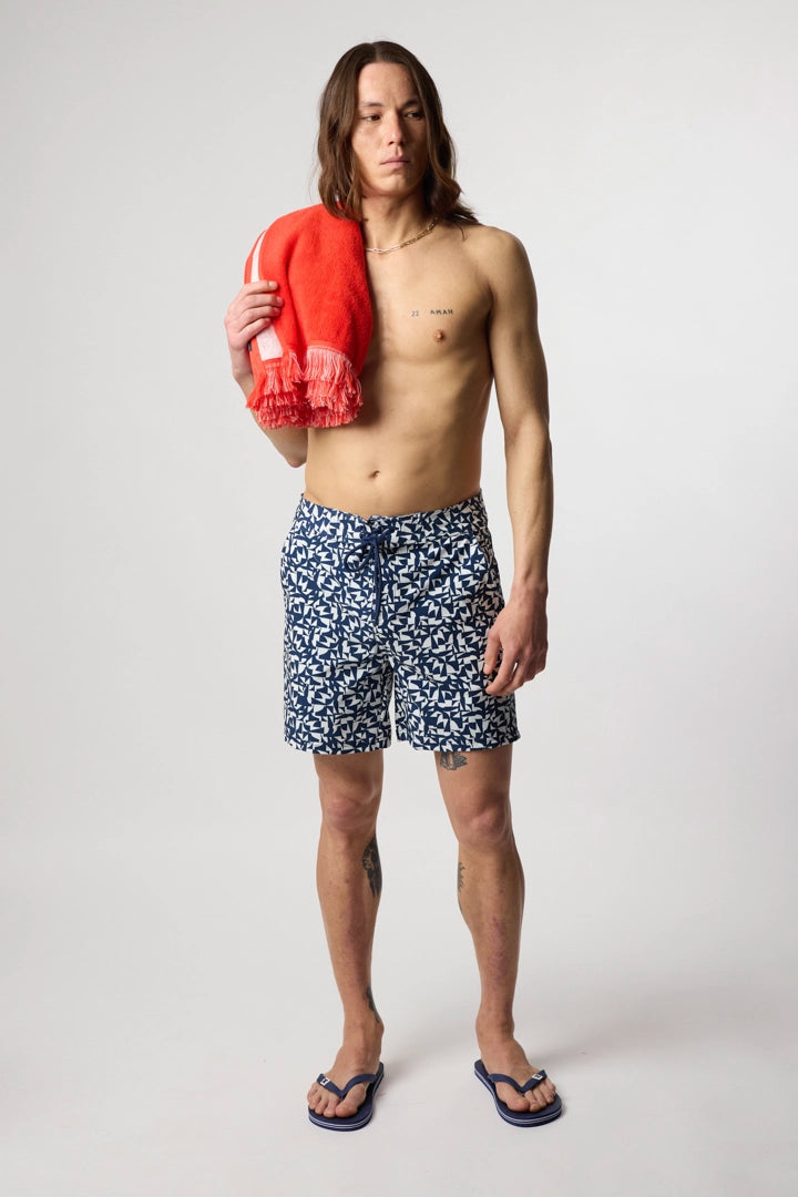Bañador de surf estampado. Cintura fija, cierre con cordón y parche bordado en la parte inferior derecha. Bolsillo trasero en la parte superior derecha.