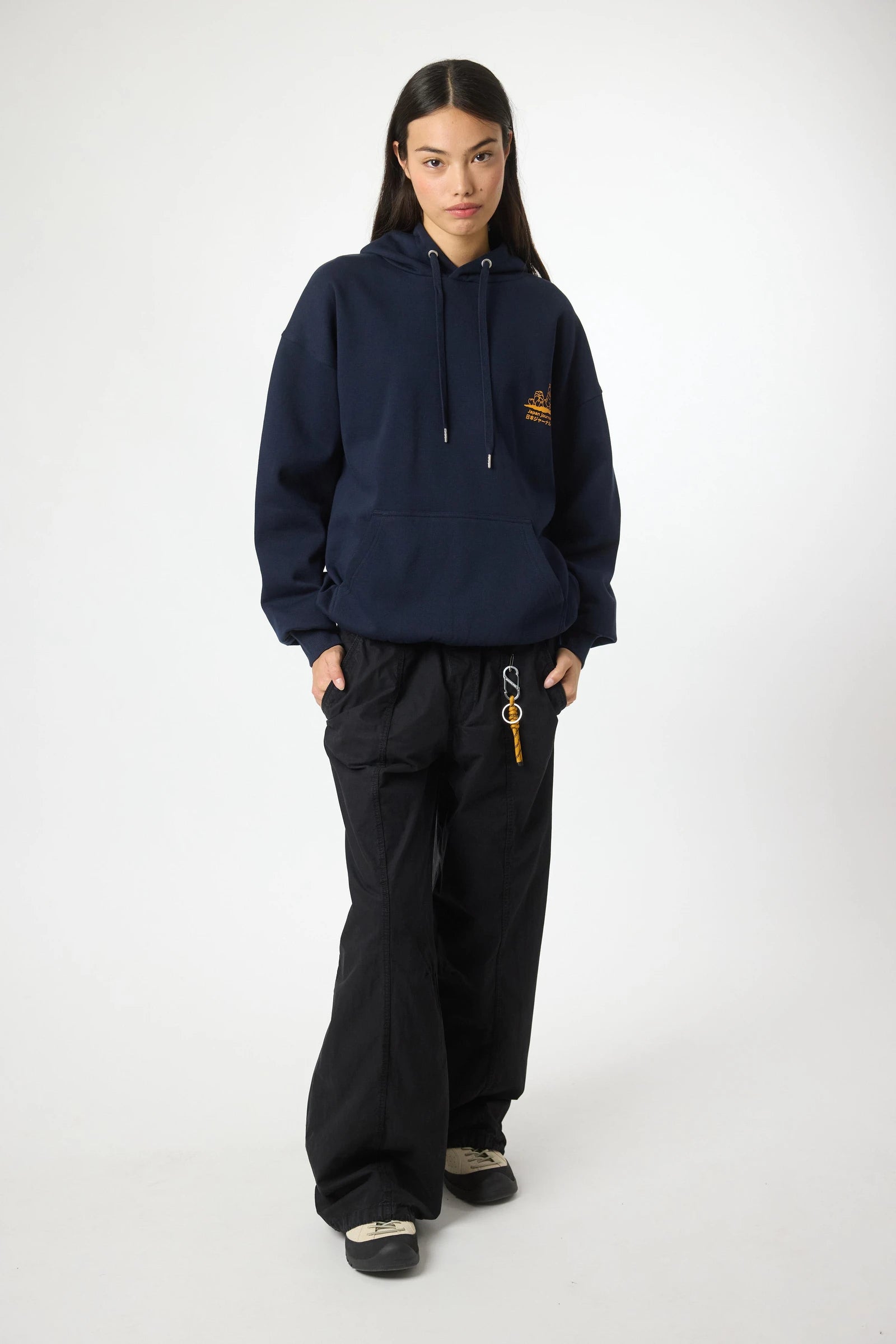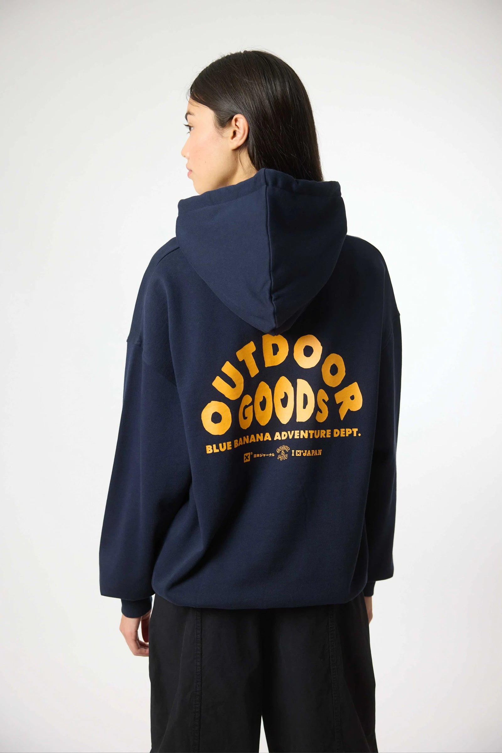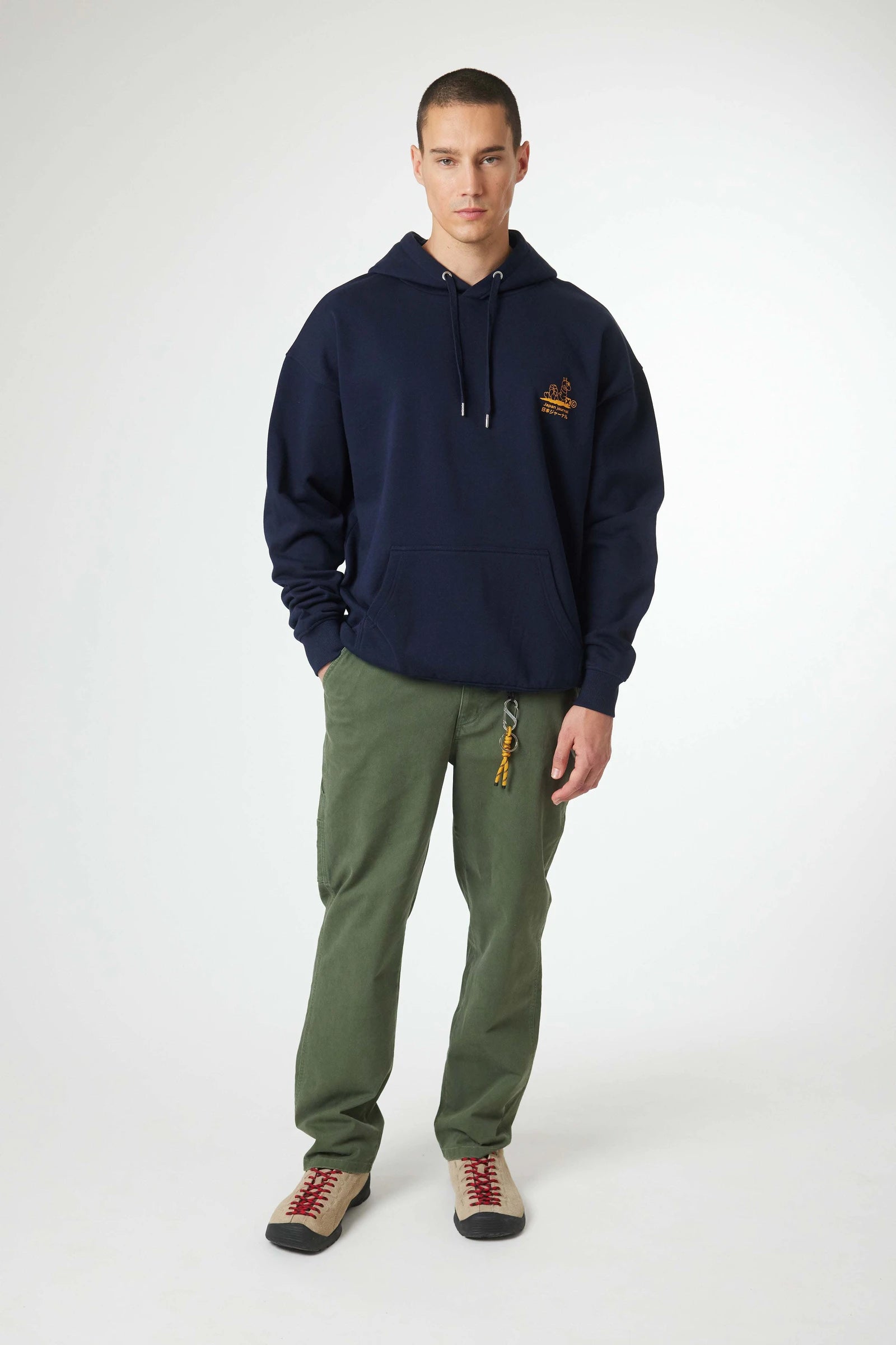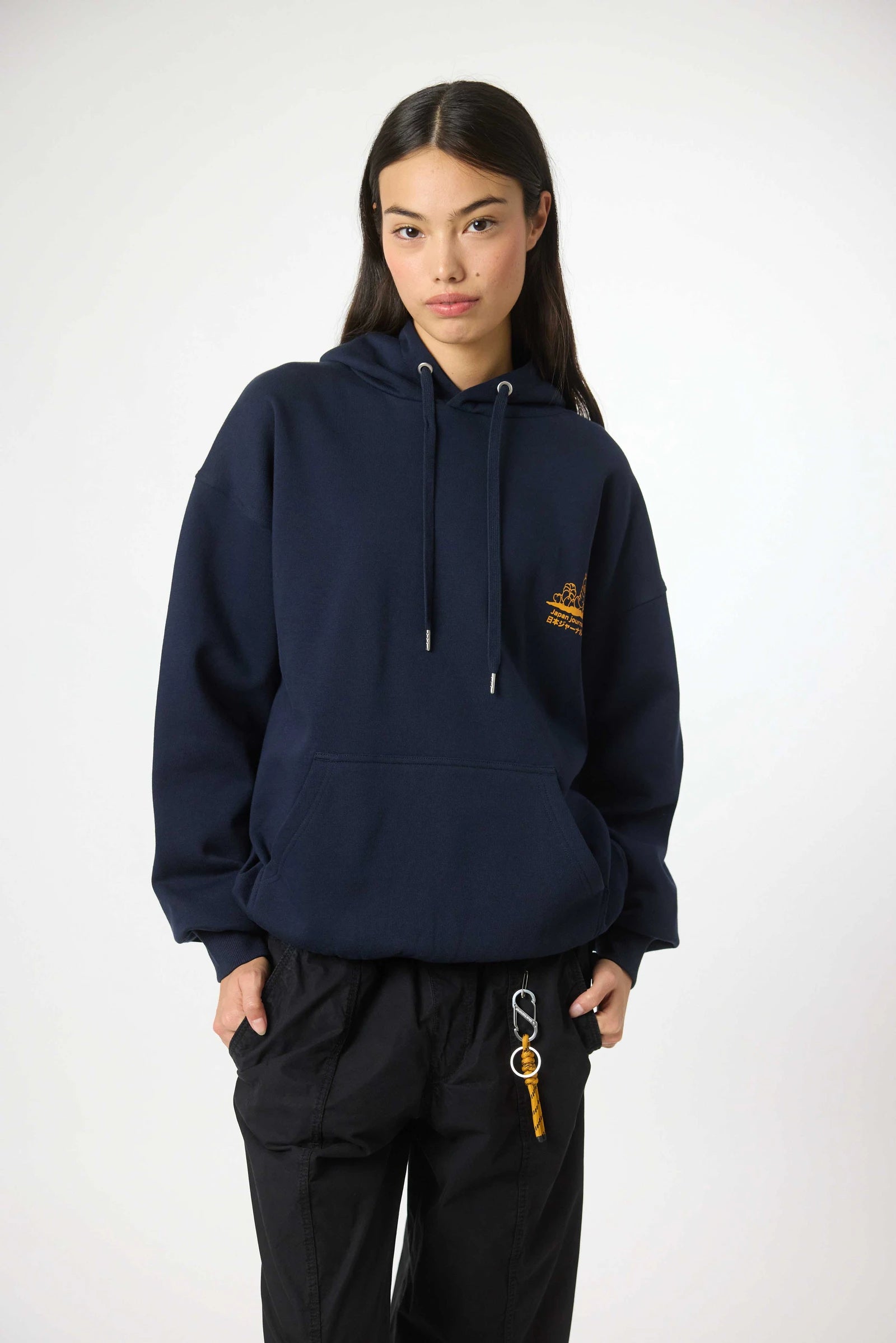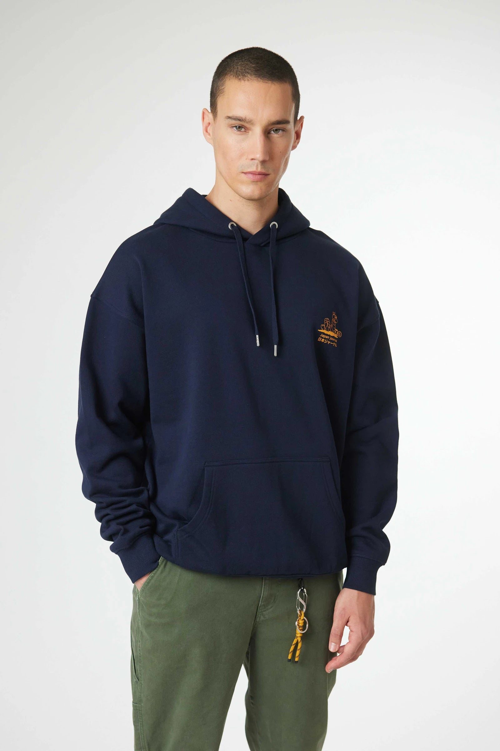 Kapuzenpullover mit Frontdruck oben links und mittigem Rückendruck. Vordere untere Tasche mit Öffnung auf beiden Seiten. Aus 100% Bio-Baumwolle gefertigt, Oversize Fit.