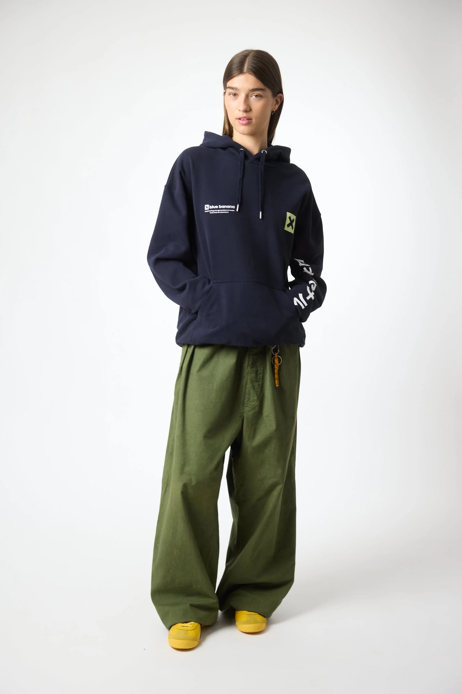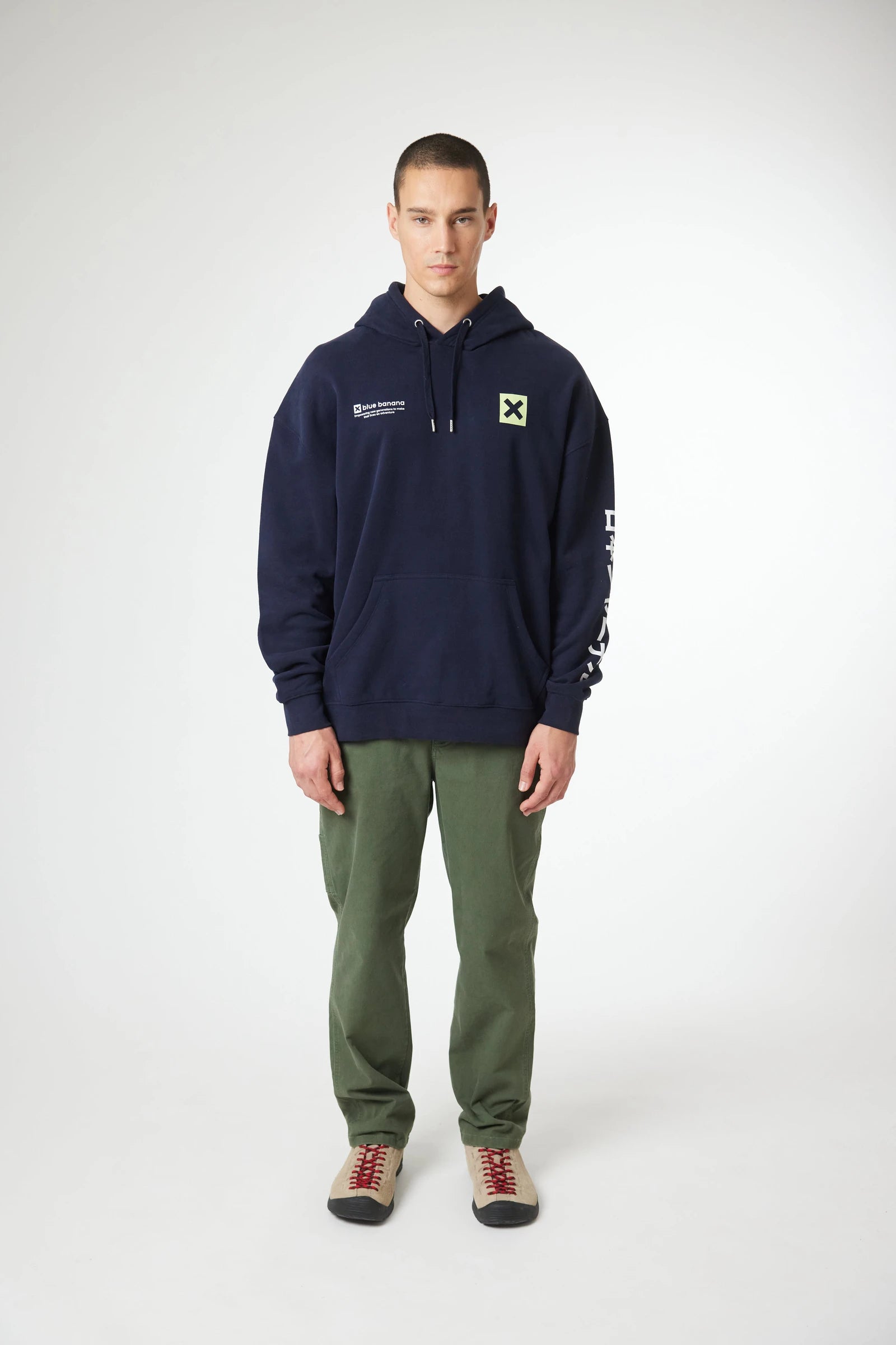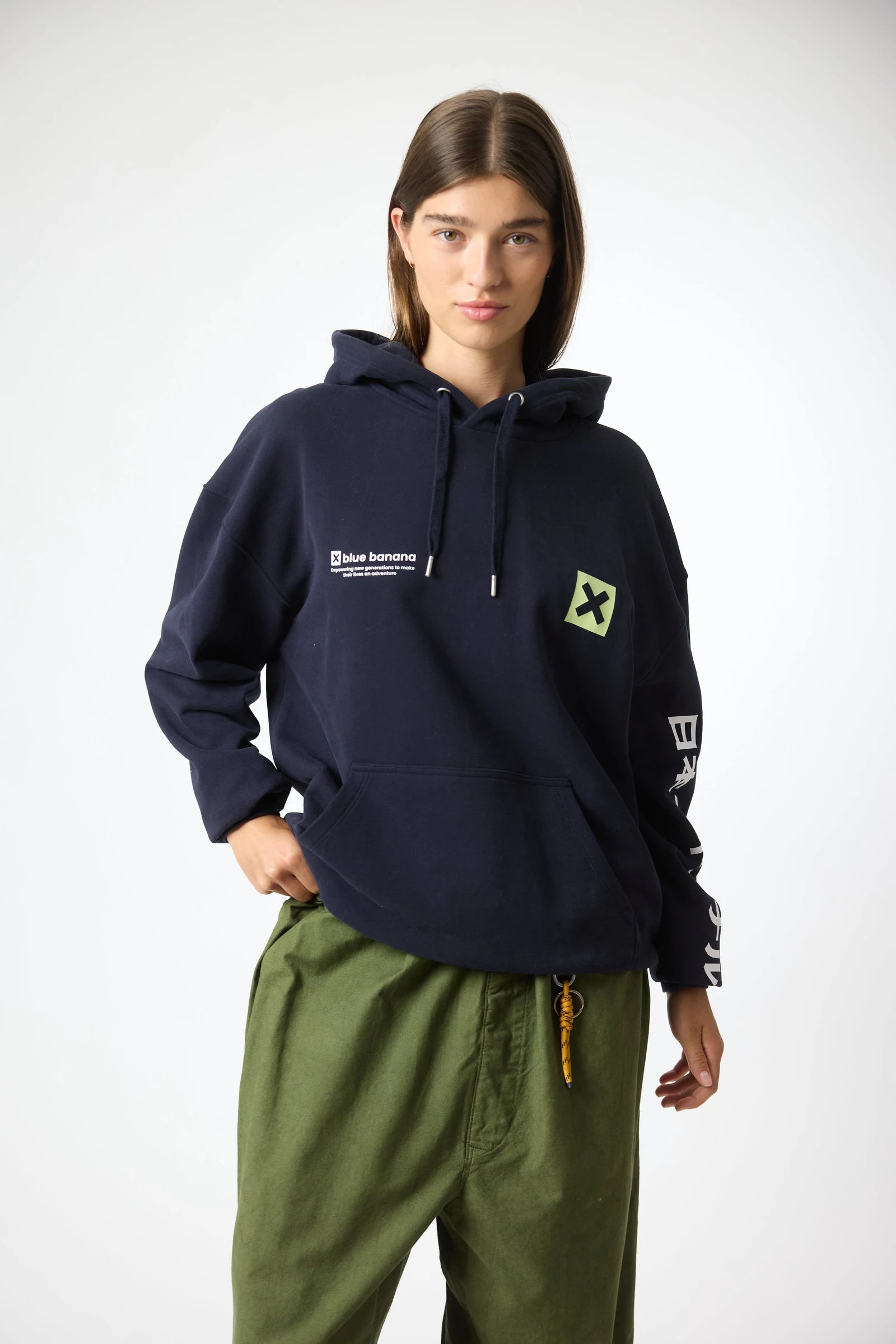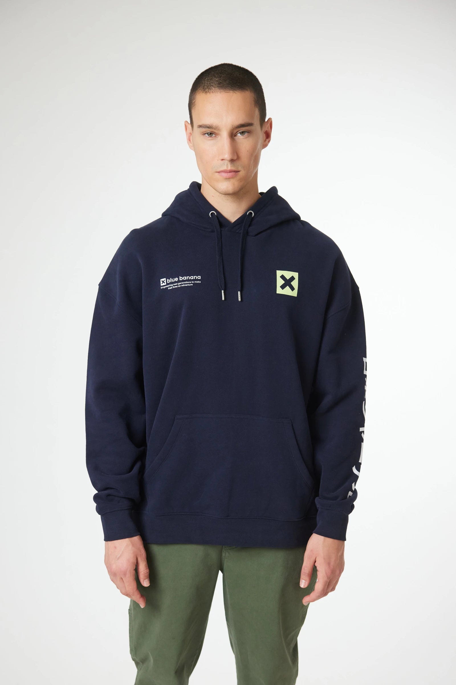 Kapuzenpullover mit unserer ikonischen X auf Brust und Rücken. Vorderes Kängurutasche mit seitlichen Eingriffen. Hergestellt aus 100% Bio-Baumwolle und Oversize-Schnitt.