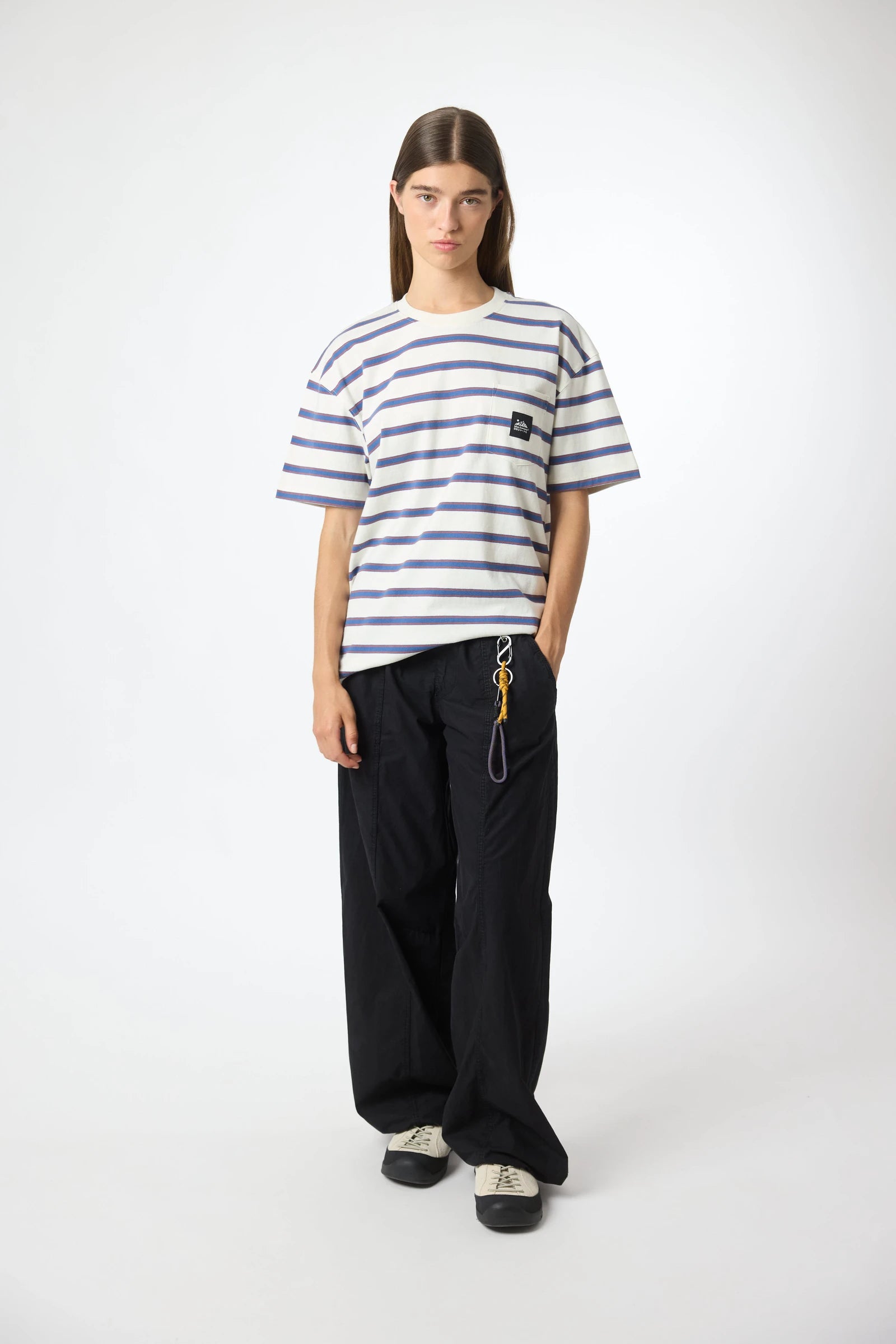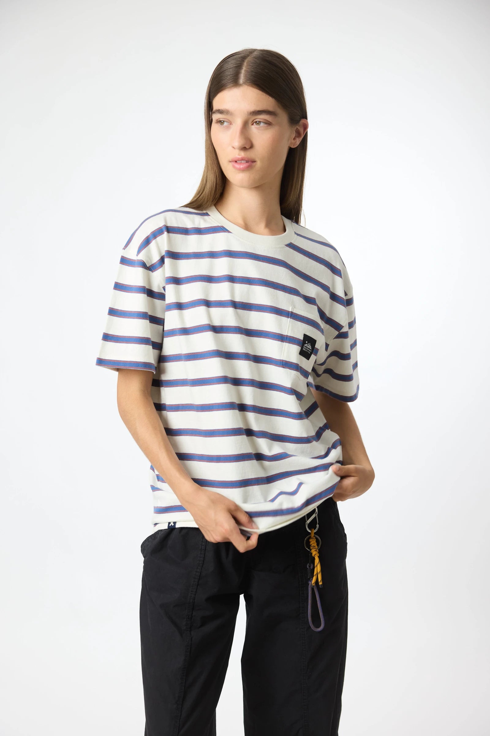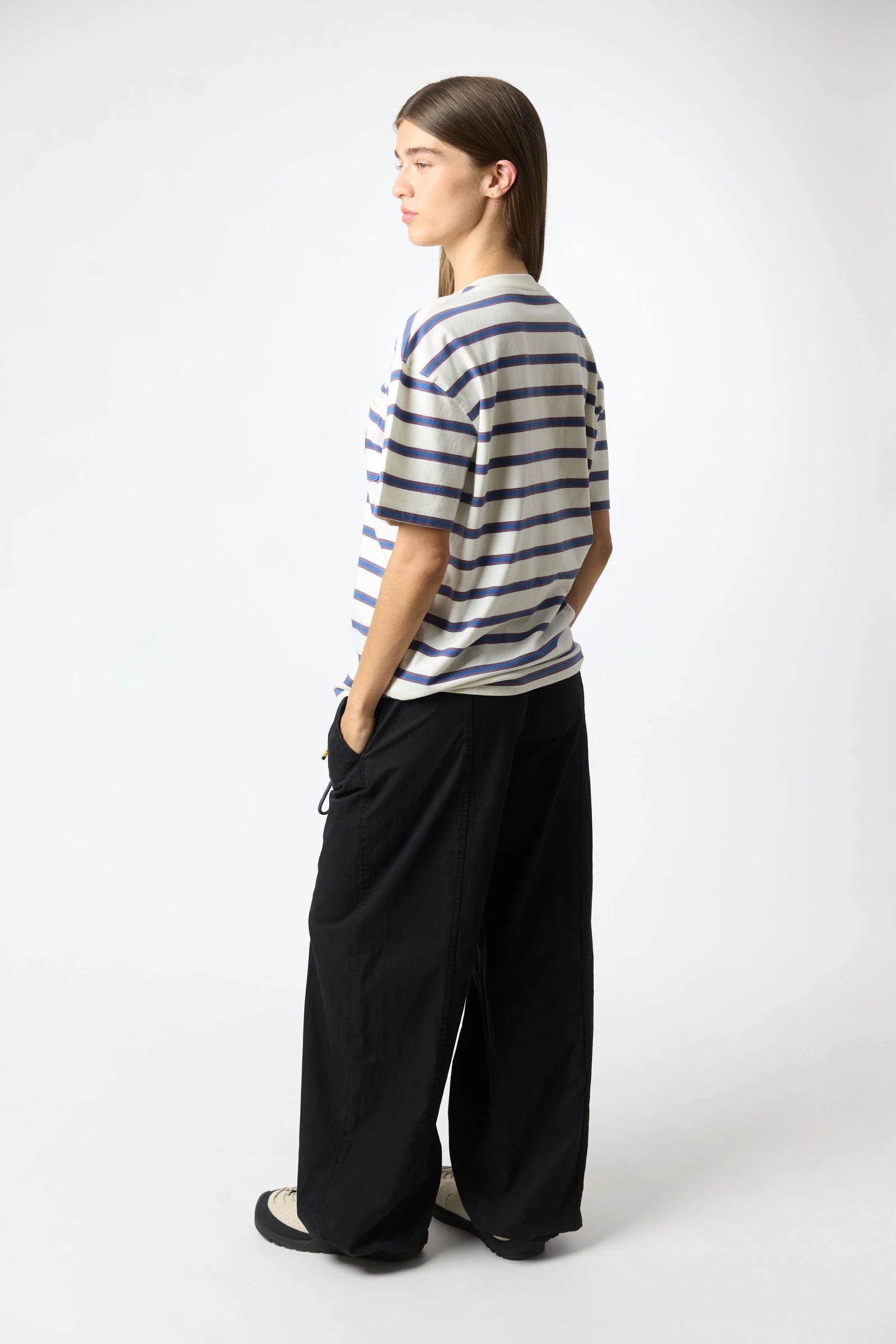 Gestreiftes T-Shirt mit Stickerei vorne auf der Brust. Hergestellt aus 100% Bio-Baumwolle und Oversize-Schnitt.