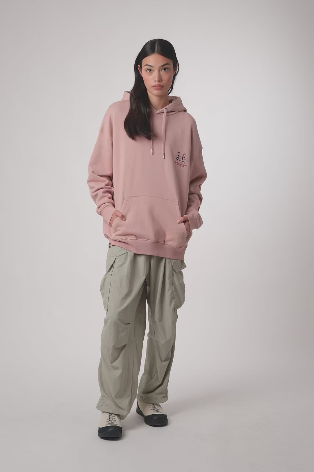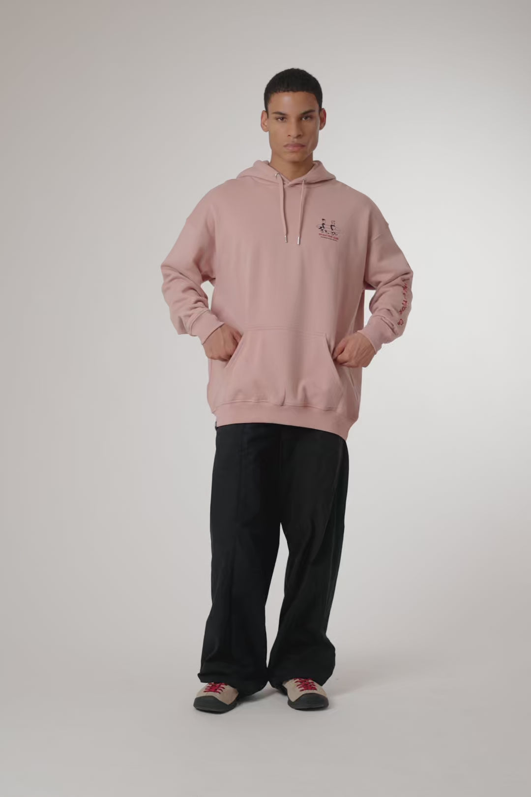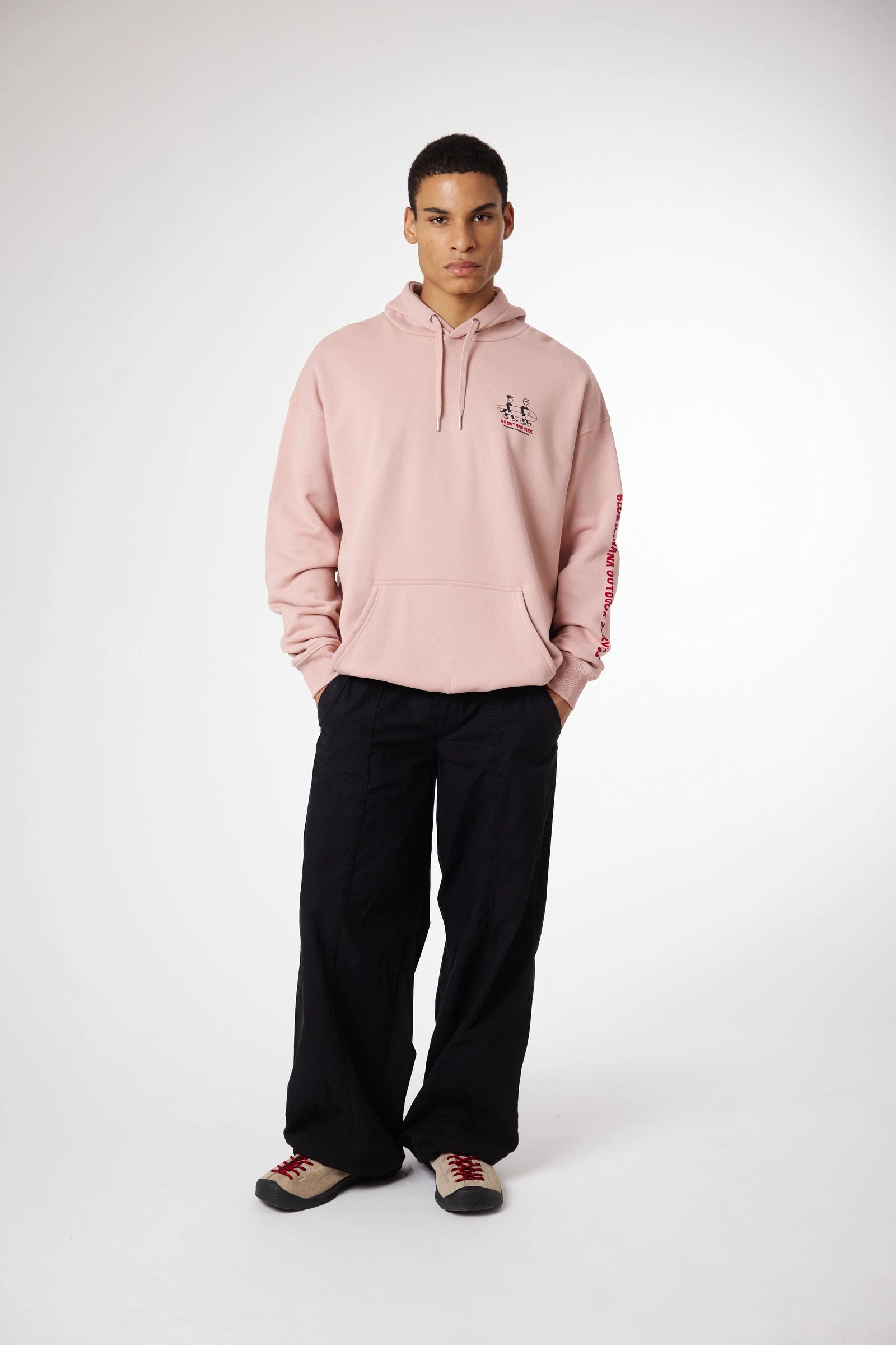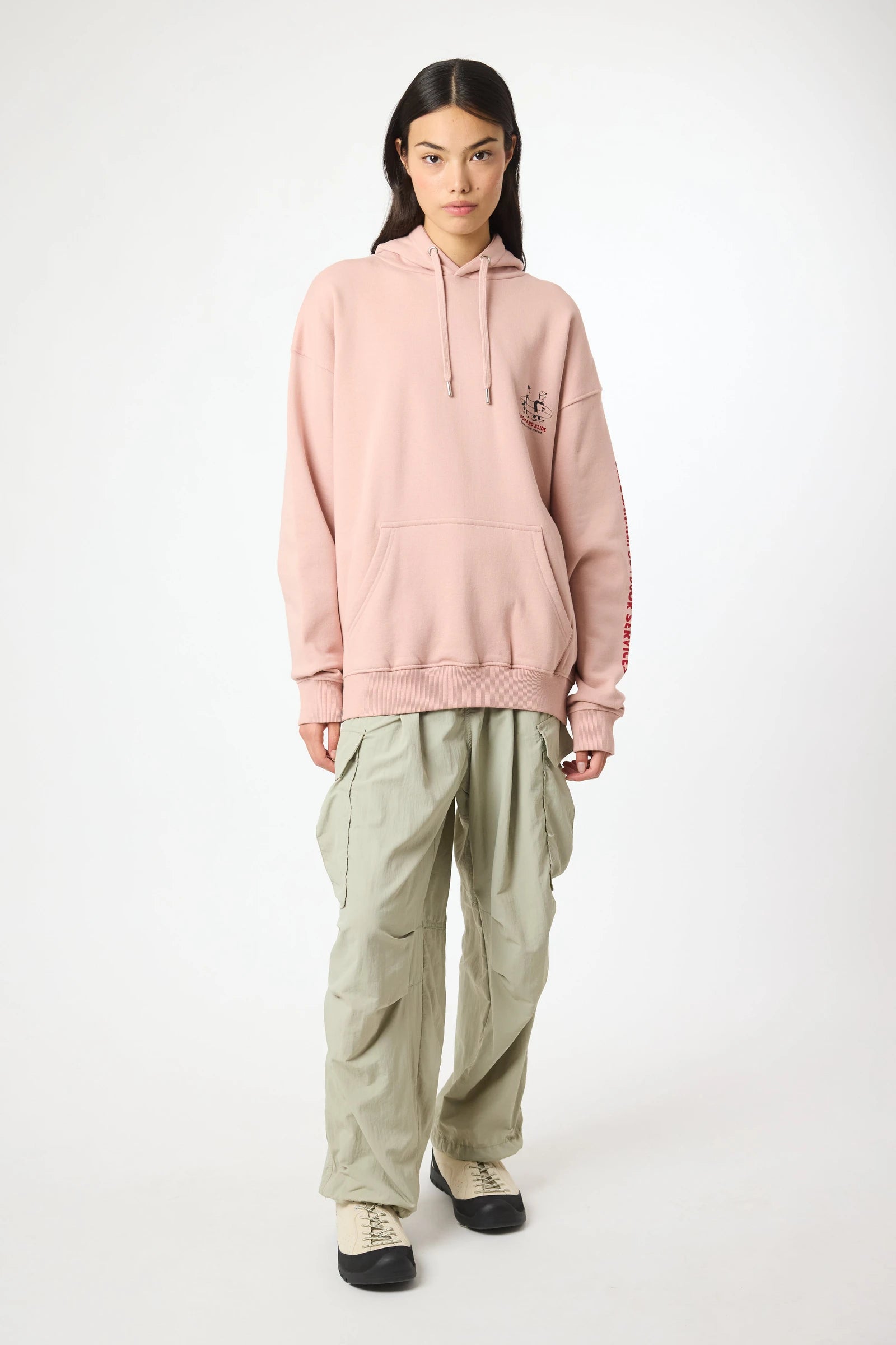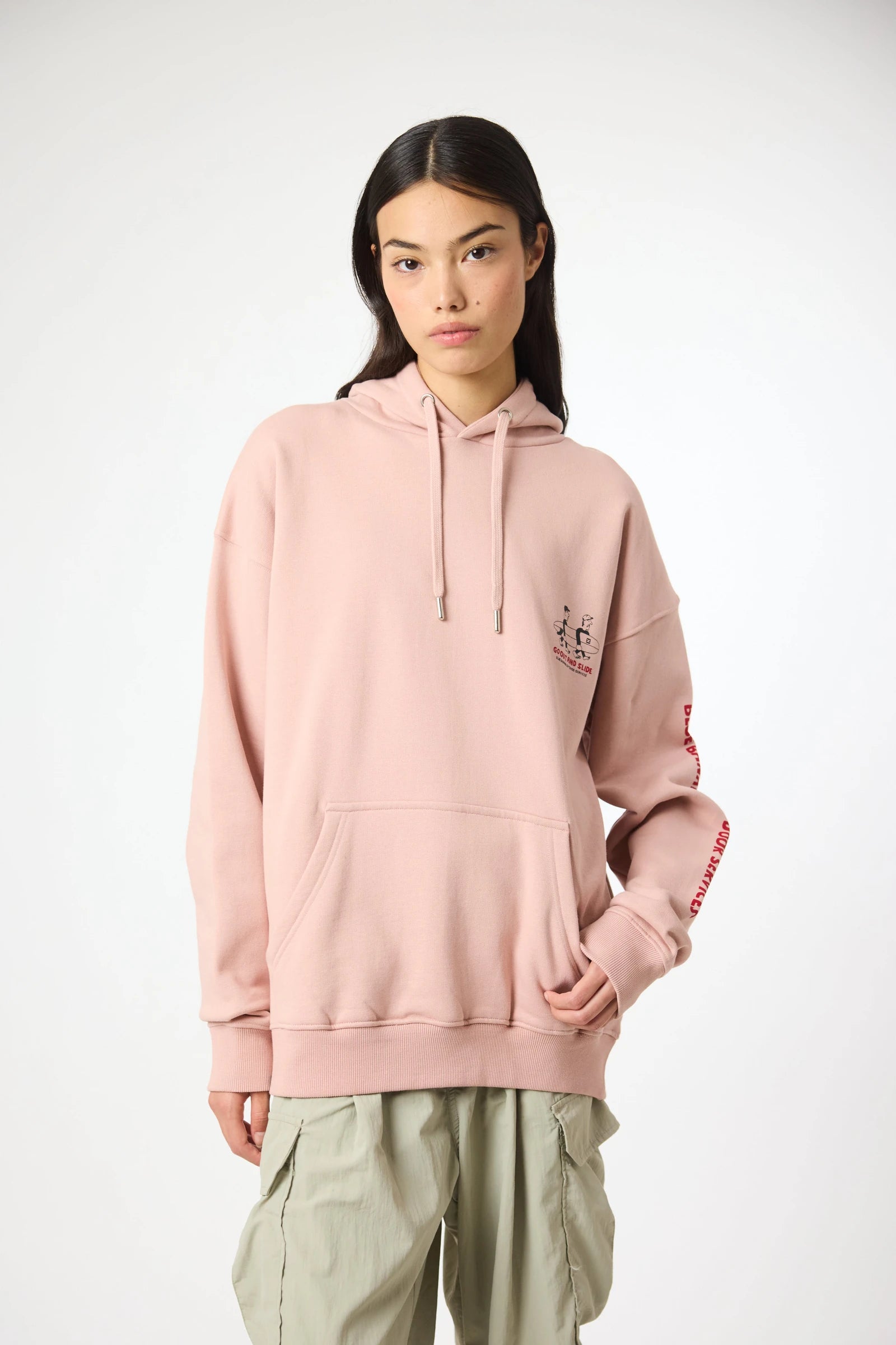 Hoodie mit Frontprint oben links und zentralem Rückenprint. Vordere Kängurutasche mit seitlichem Eingriff. Hergestellt aus 100% Bio-Baumwolle und Oversize-Schnitt.