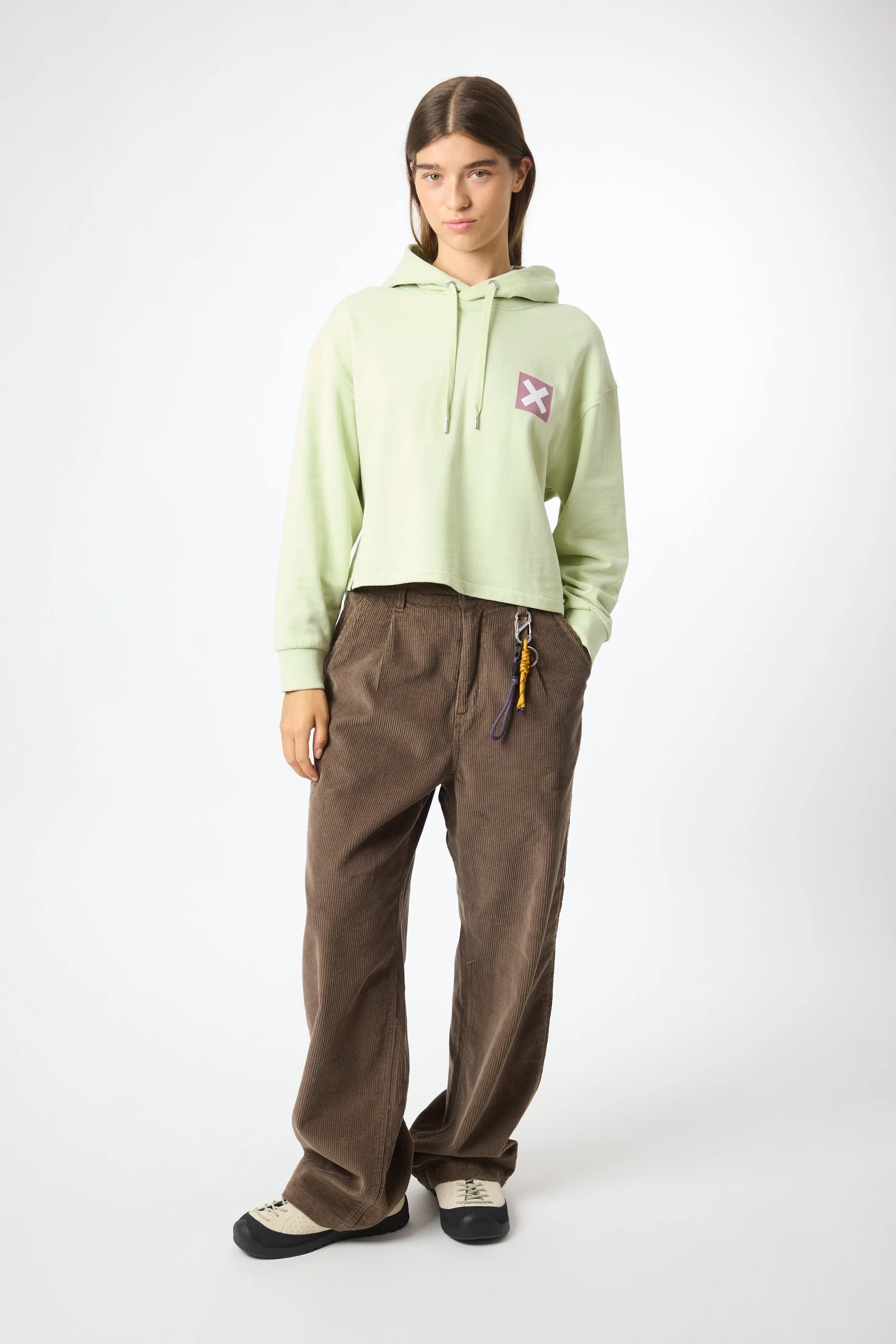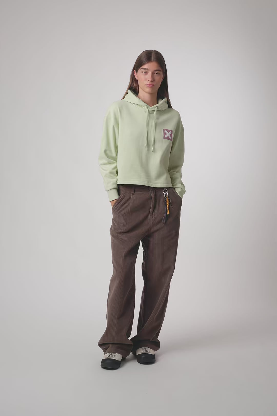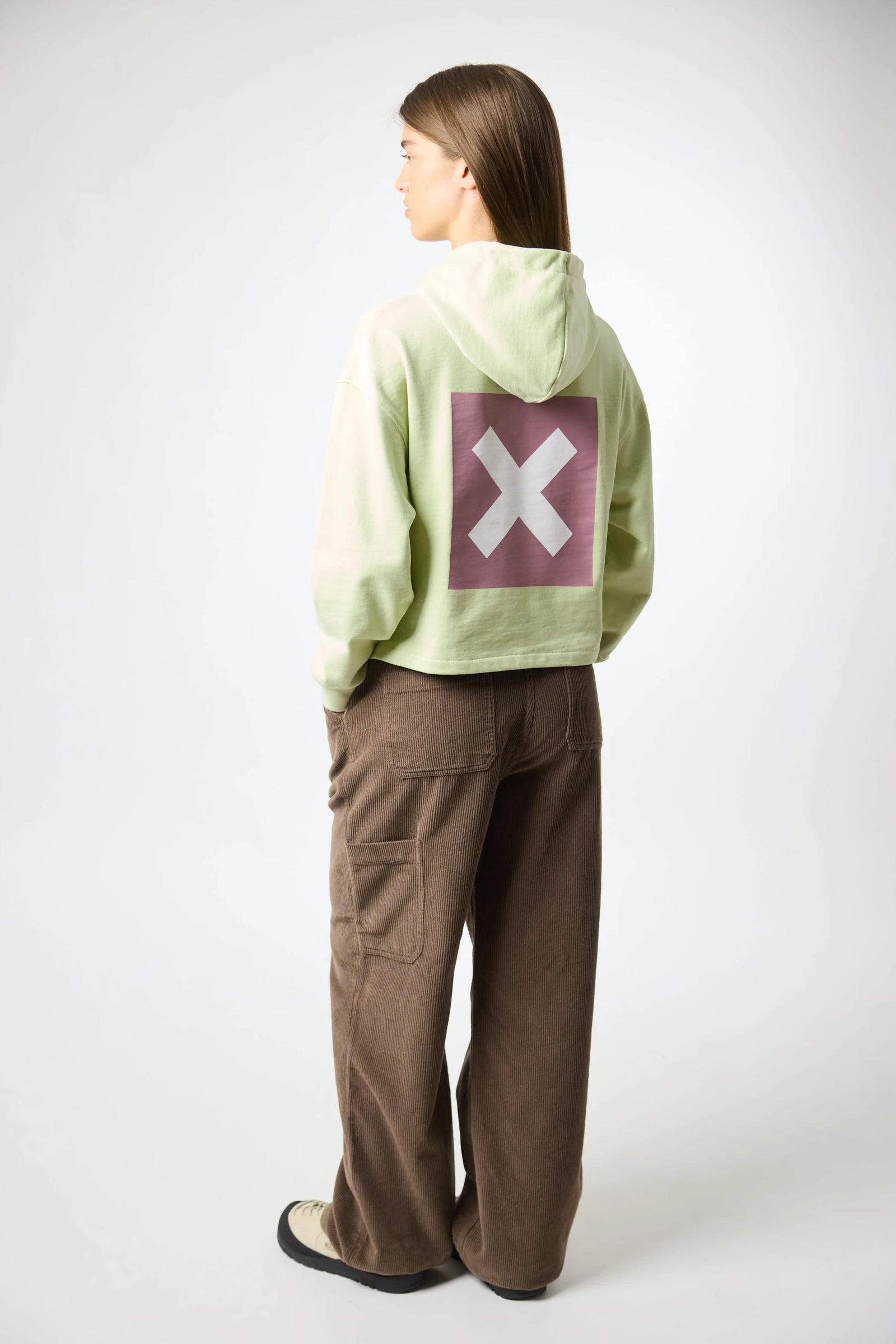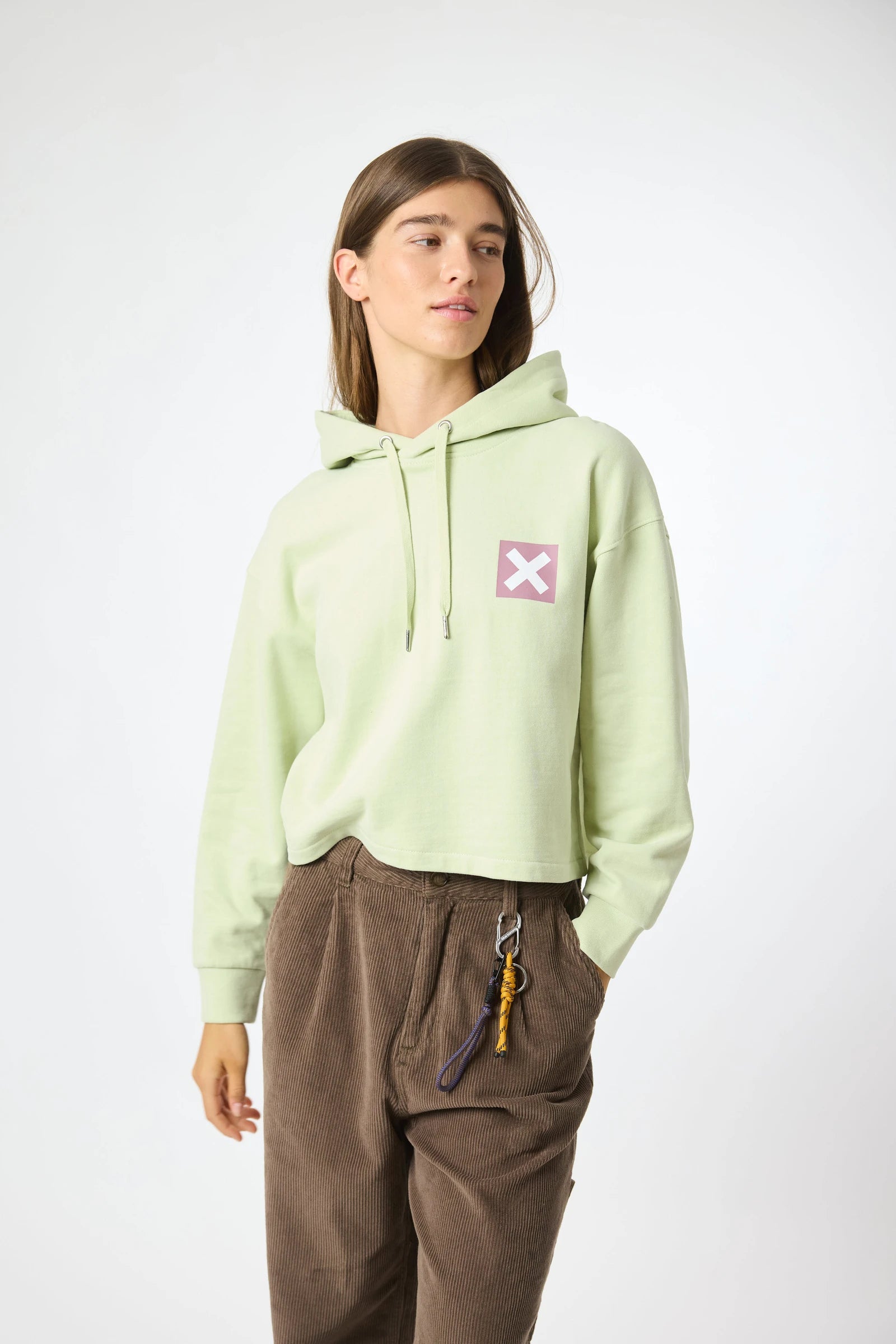 Hoodie mit Front- und Rückenprint. Hergestellt aus 100% Bio-Baumwolle und Cropped Fit.