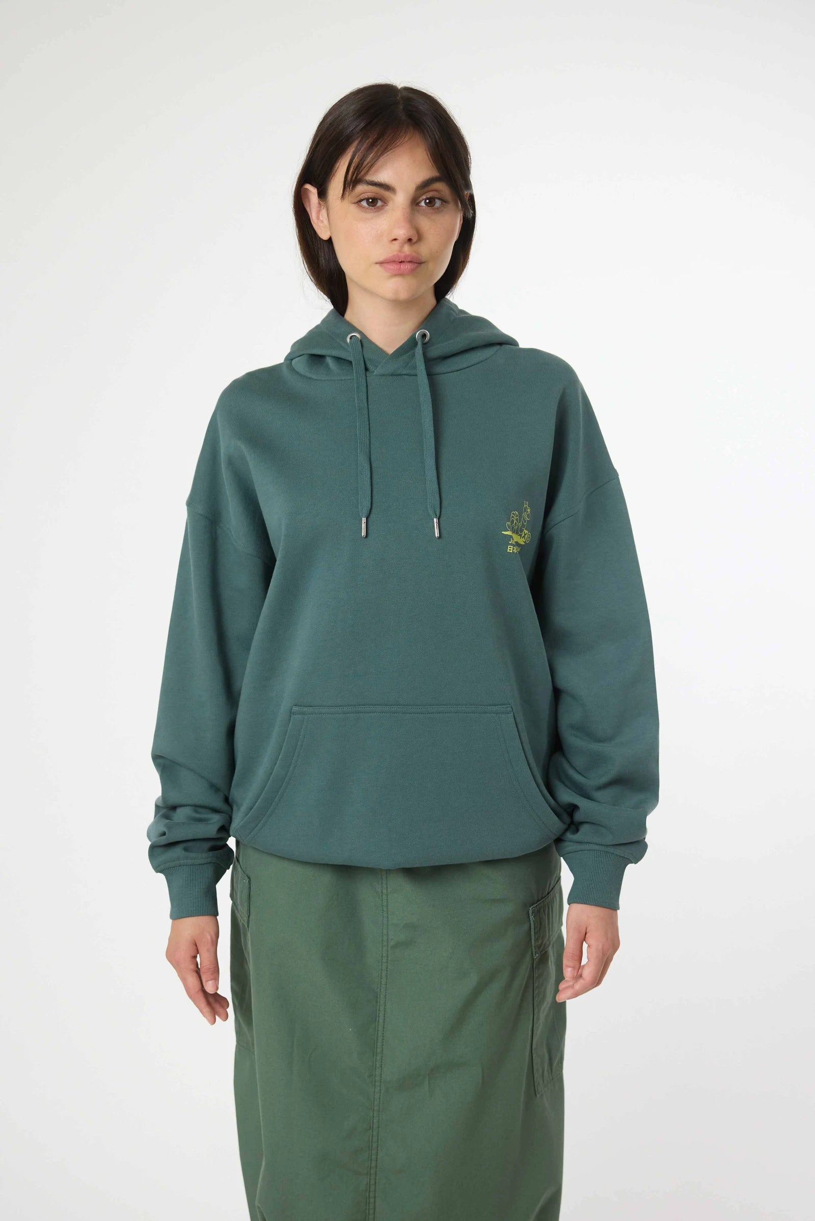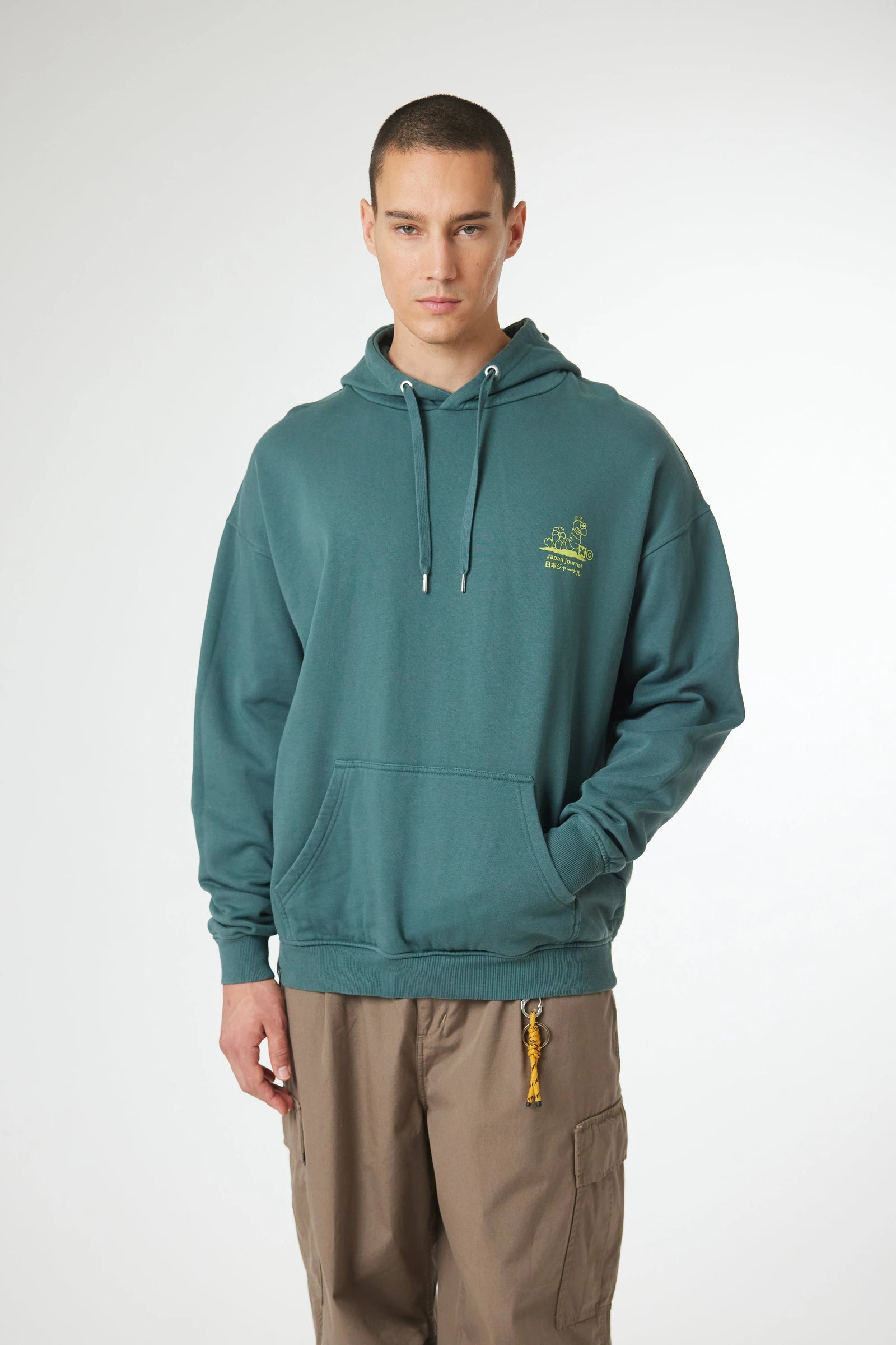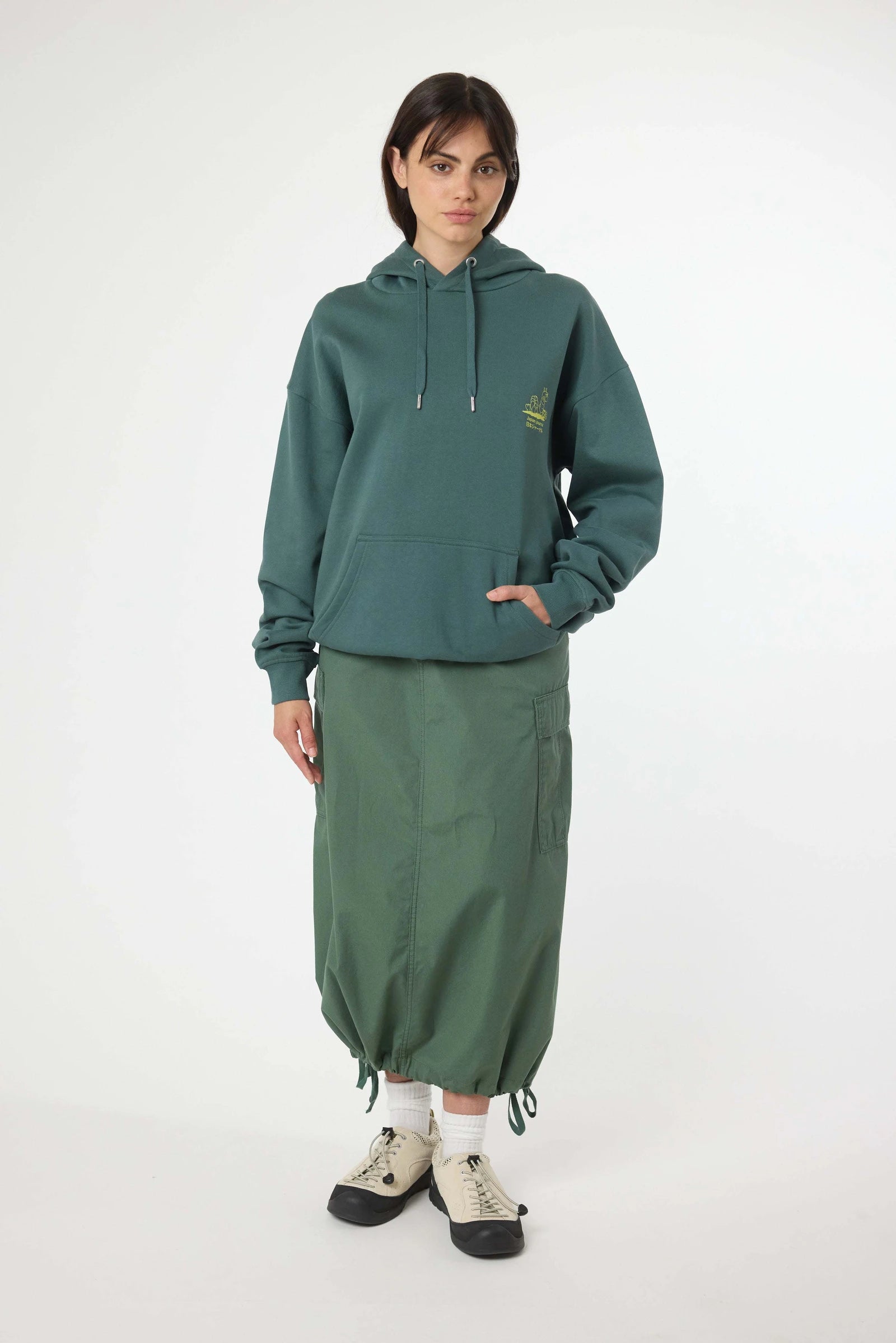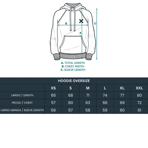 Kapuzenpullover mit Frontdruck oben links und mittigem Rückendruck. Vordere untere Tasche mit Öffnung auf beiden Seiten. Aus 100% Bio-Baumwolle gefertigt, Oversize Fit.