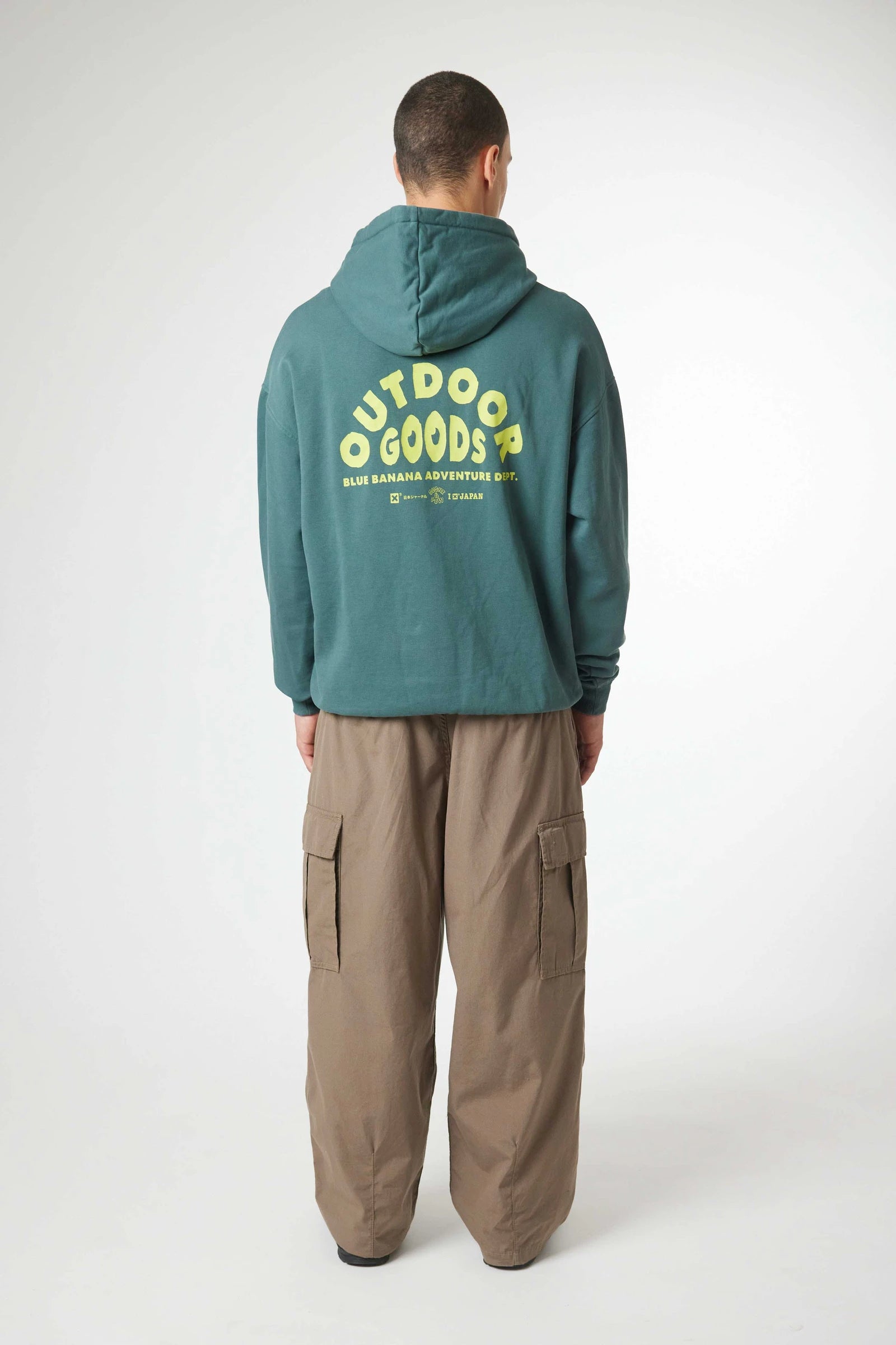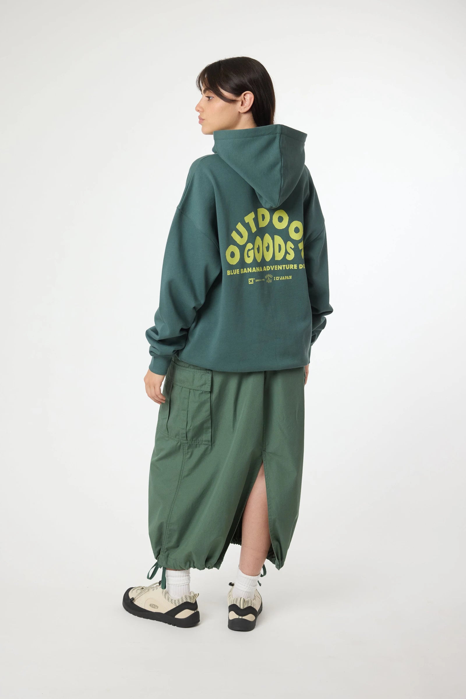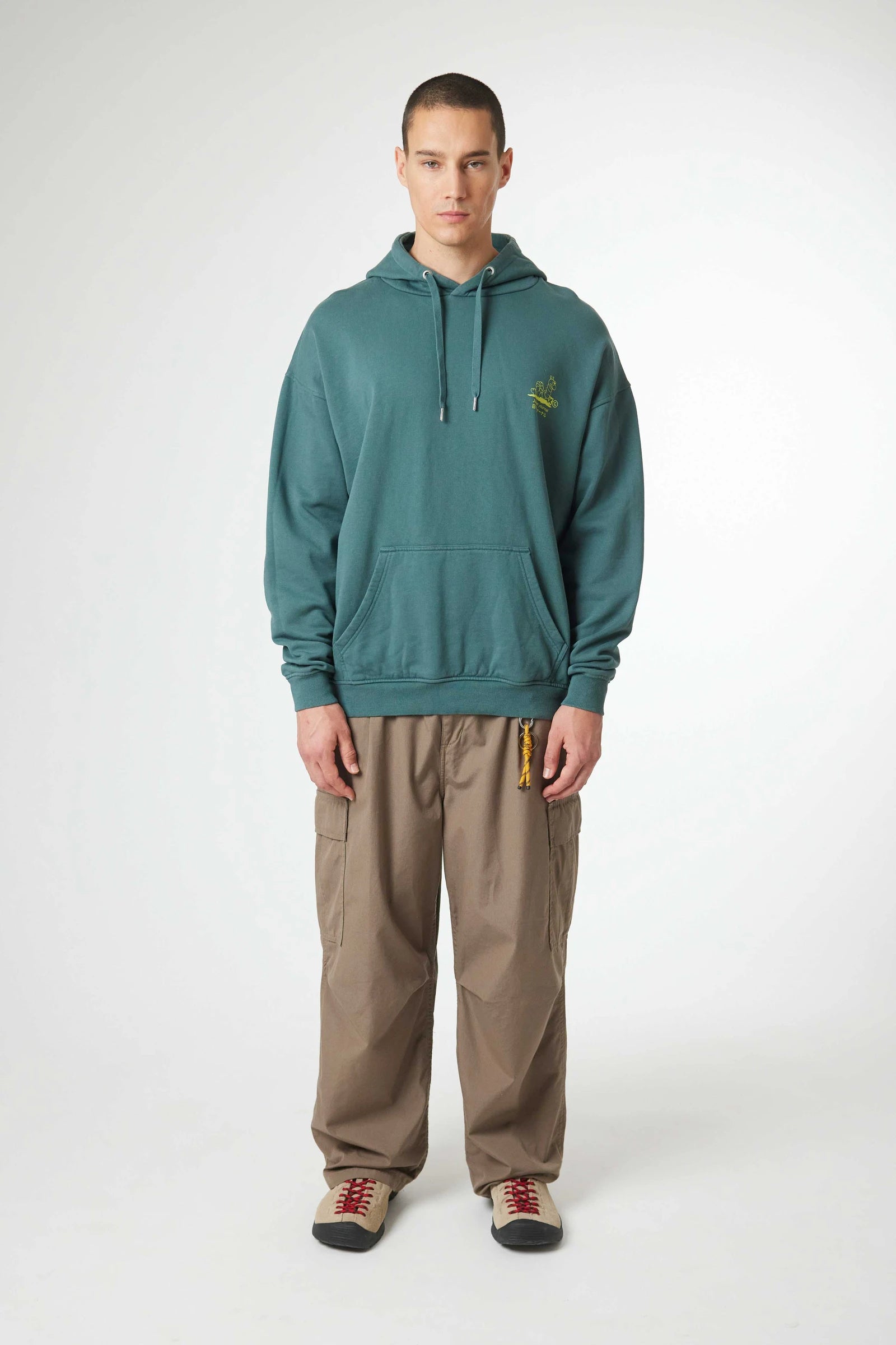 Kapuzenpullover mit Frontdruck oben links und mittigem Rückendruck. Vordere untere Tasche mit Öffnung auf beiden Seiten. Aus 100% Bio-Baumwolle gefertigt, Oversize Fit.