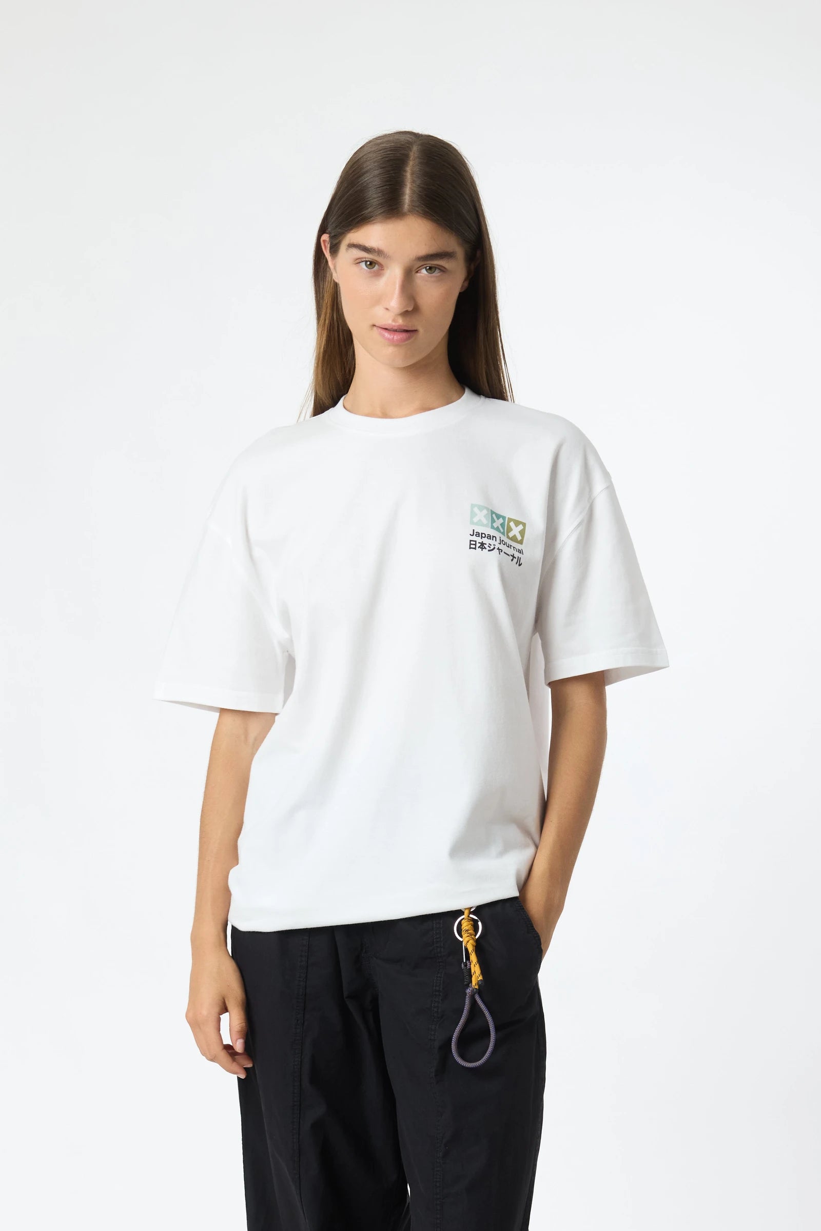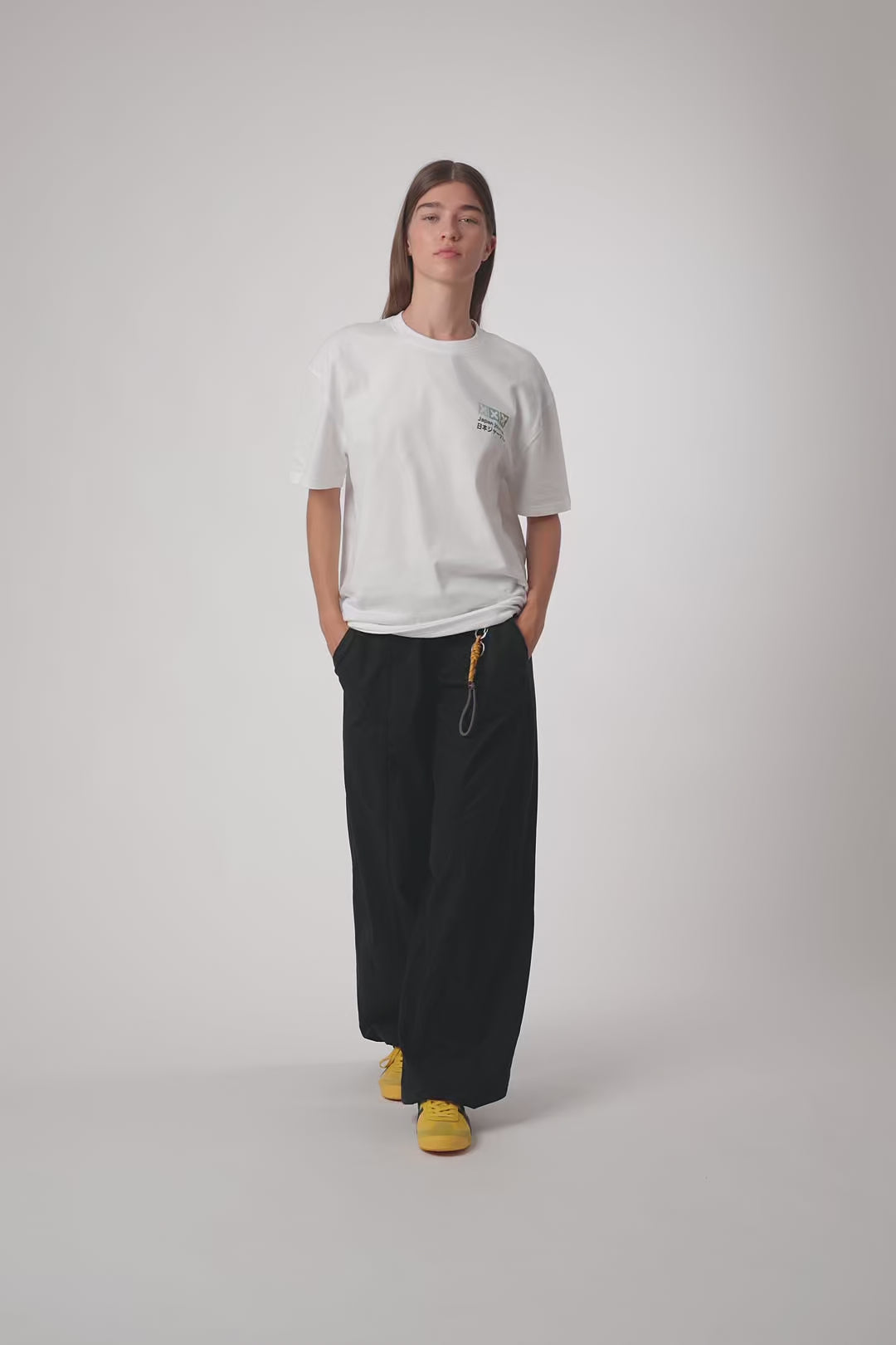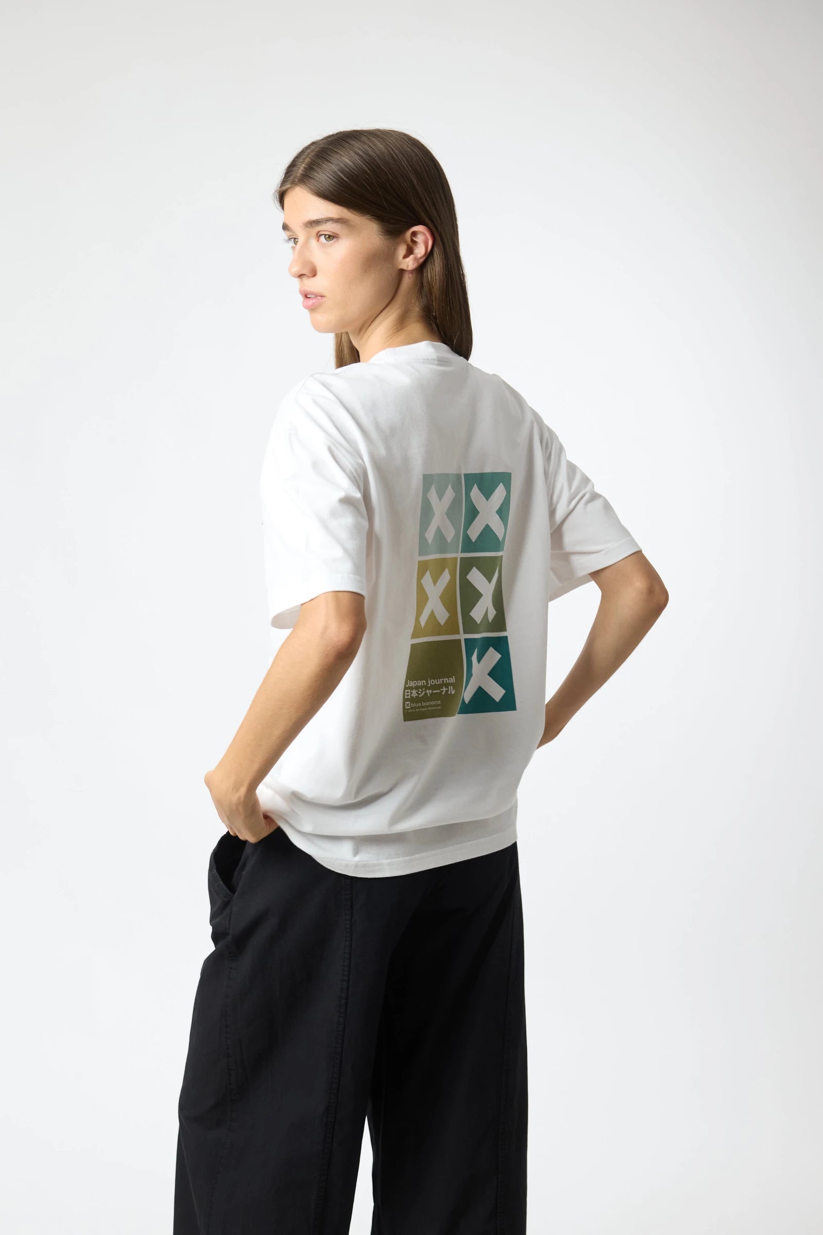 T-Shirt mit Frontprint oben links und zentralem Rückenprint. Hergestellt aus 100% Bio-Baumwolle und Oversize-Schnitt.