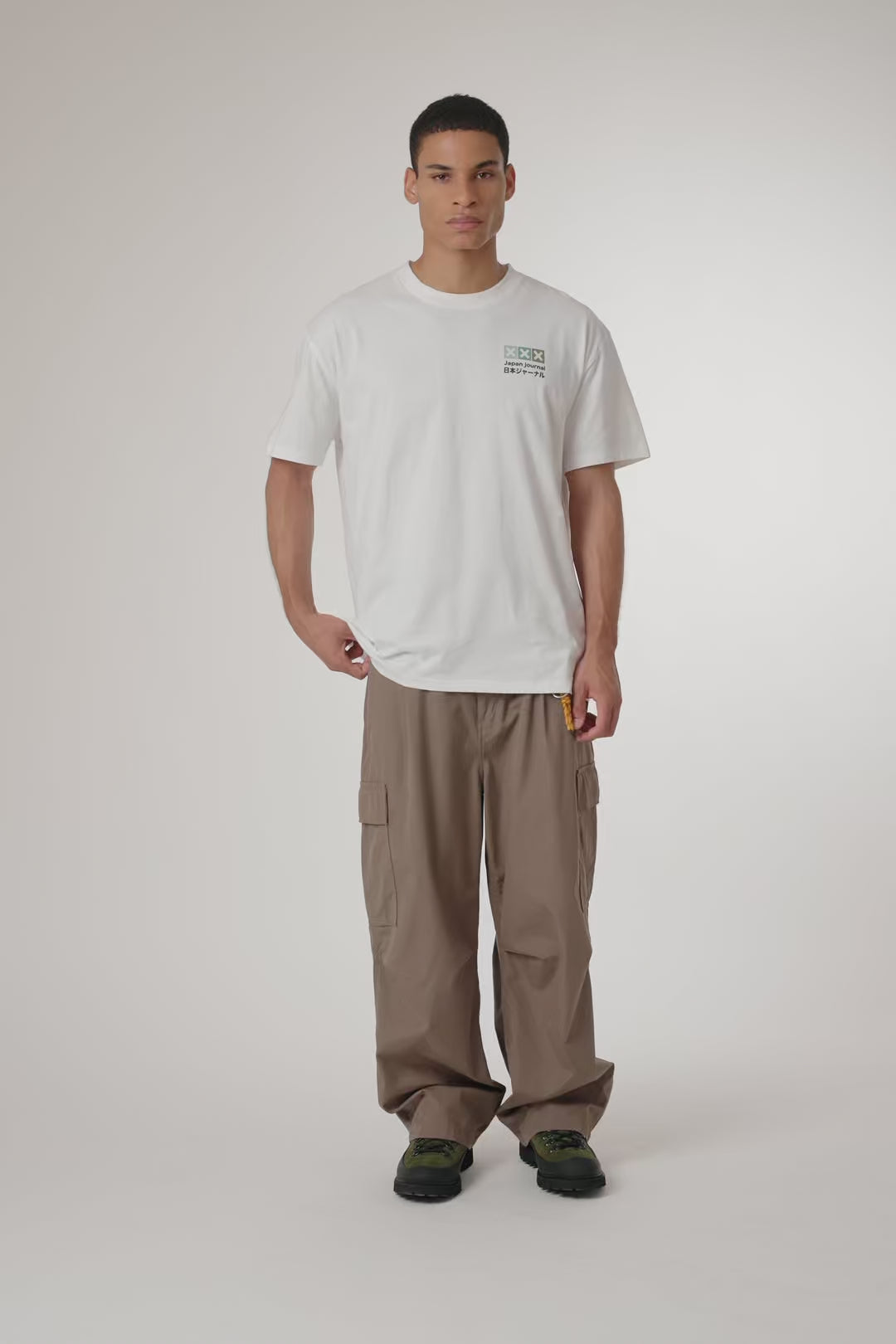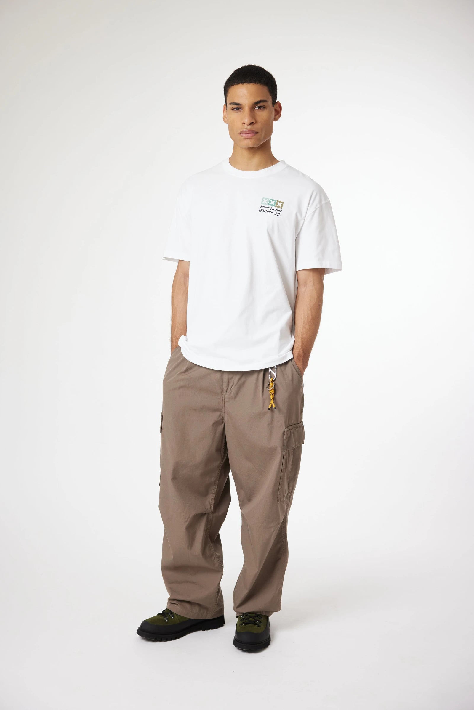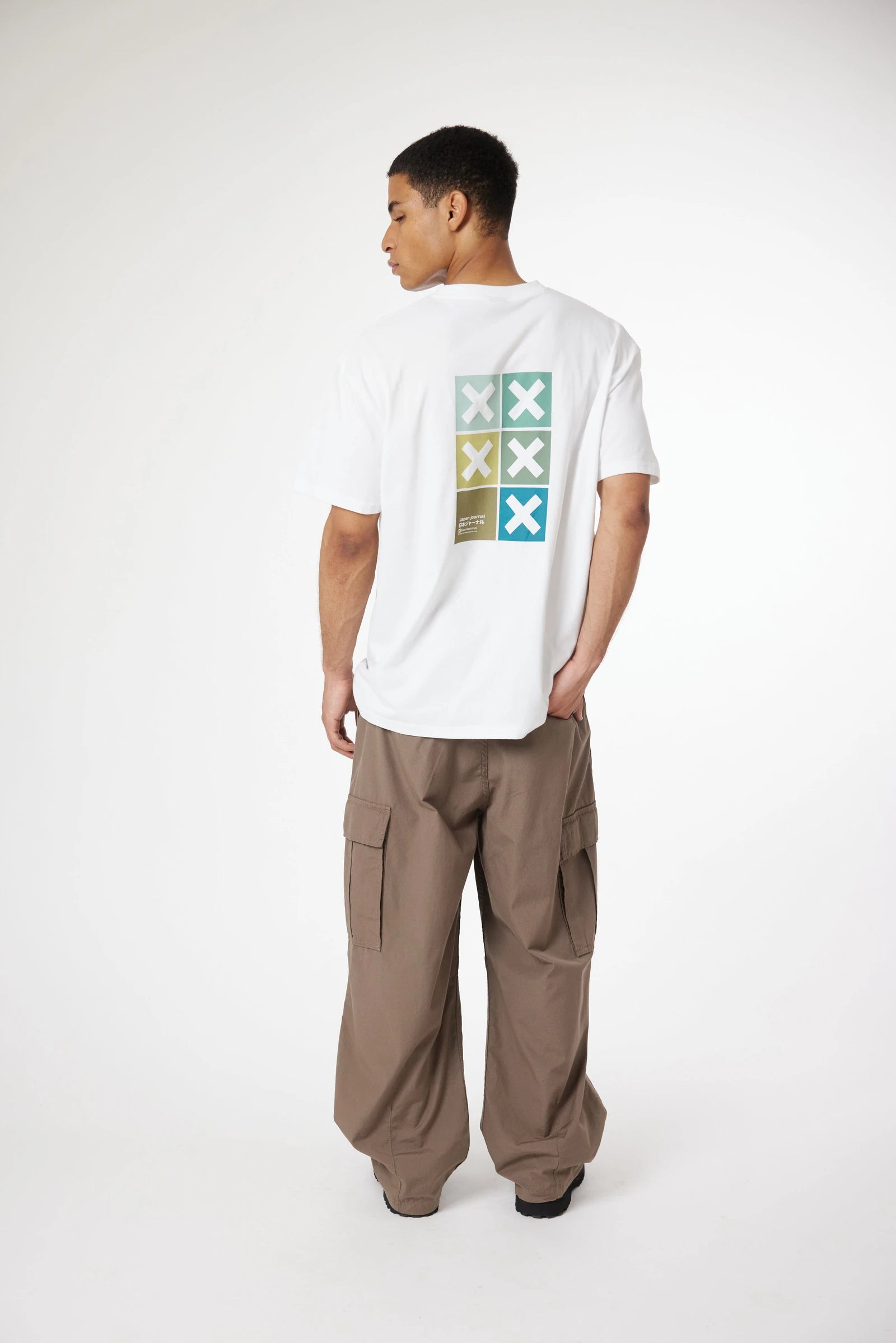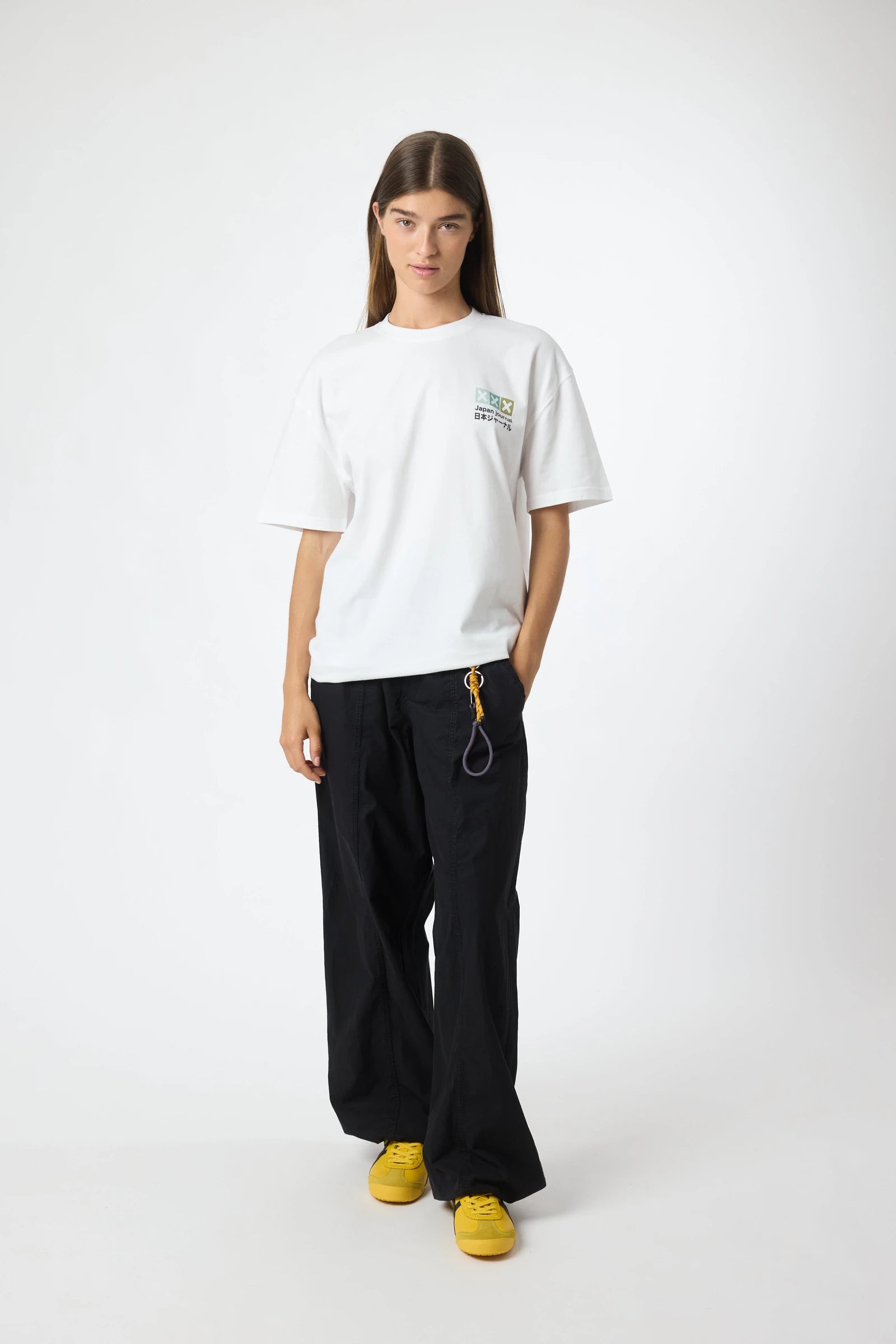 T-Shirt mit Frontprint oben links und zentralem Rückenprint. Hergestellt aus 100% Bio-Baumwolle und Oversize-Schnitt.