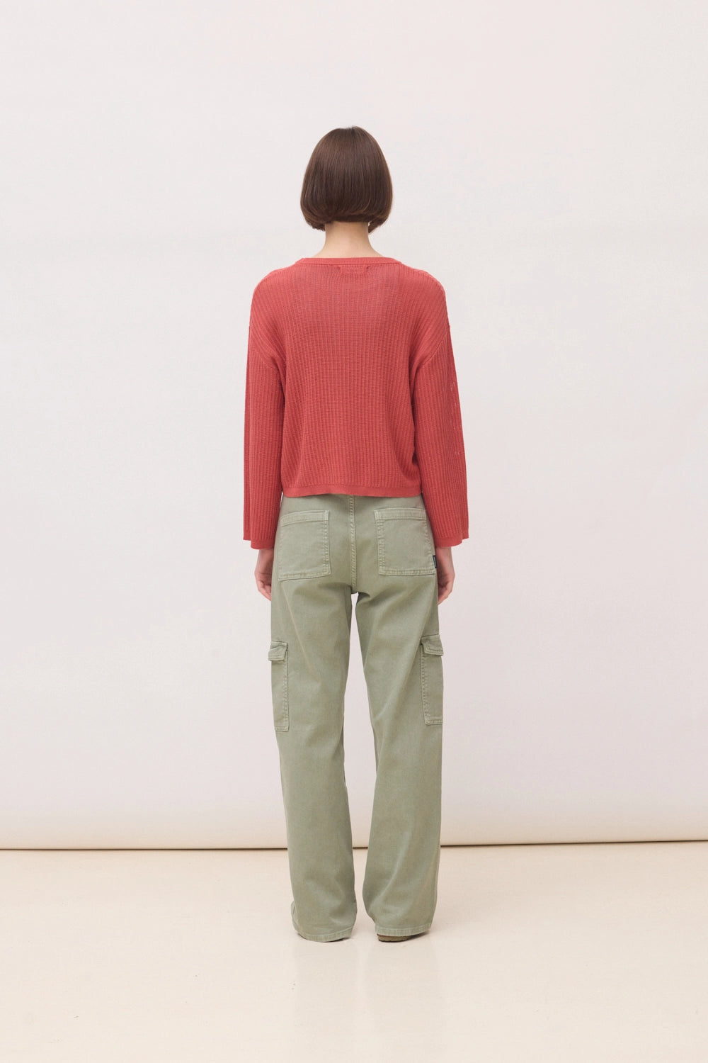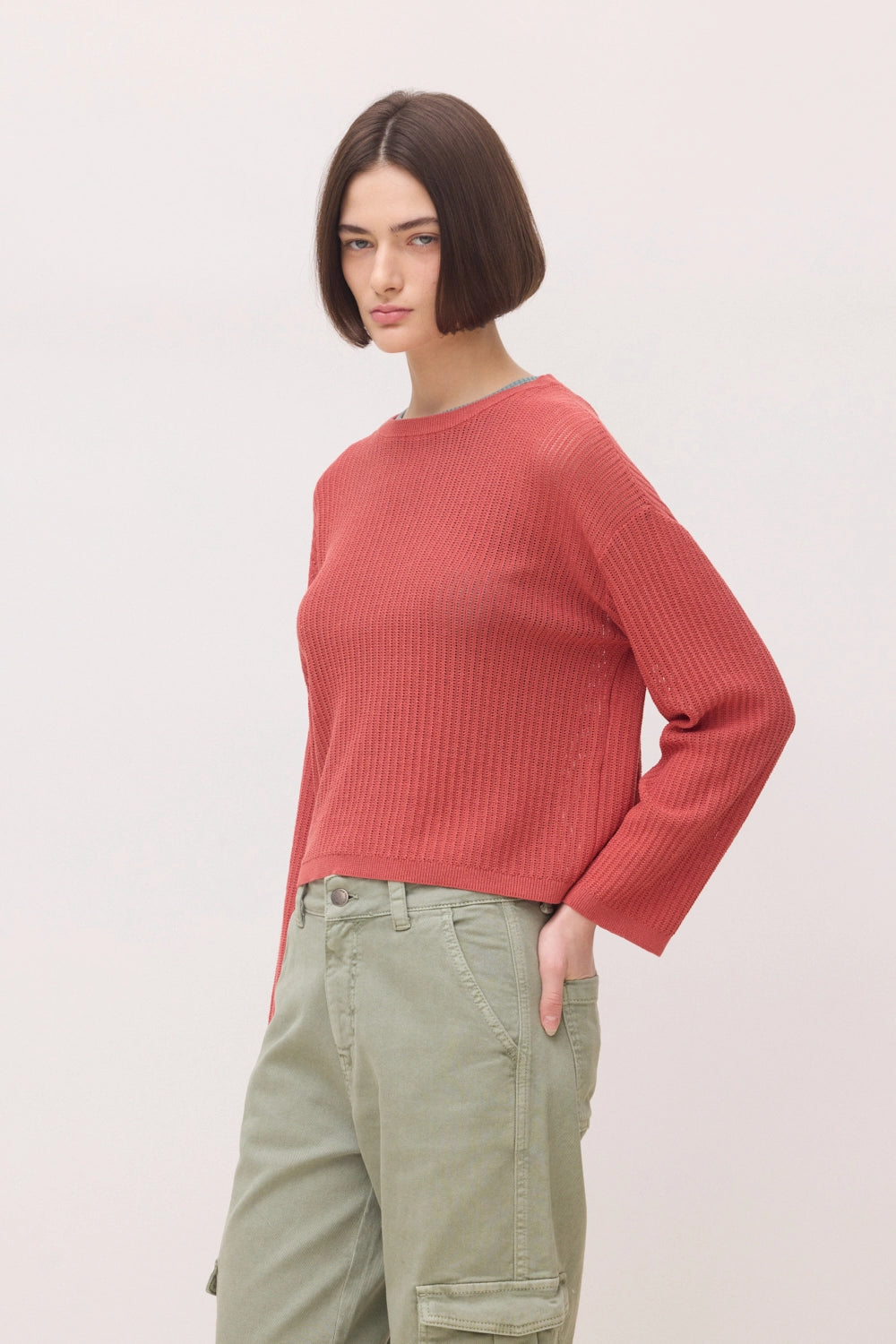 Jersey de punto calado con estructura de canalé. Hombro caído. Cuello redondo con acabado en punto liso. Parche de logo en bajo izquierdo y corte oversize.